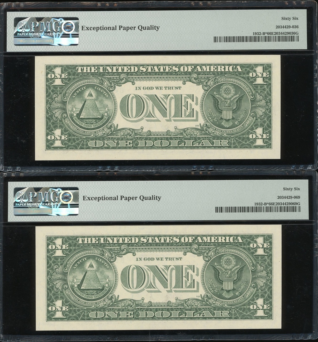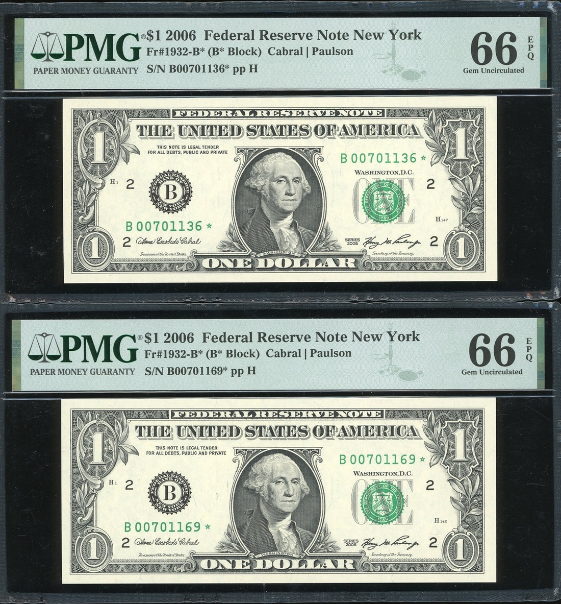 Unites States, Federal Reserve Note New York, a pair of $1, 2006, Cabral / Paulson, serial numbers B00701136* pp H and B00701169* pp H, (Fr# 1932-B*), both graded PMG 66EPQ Gem Uncirculated (2).