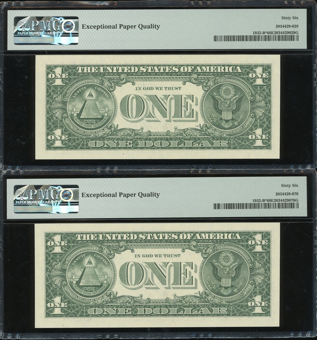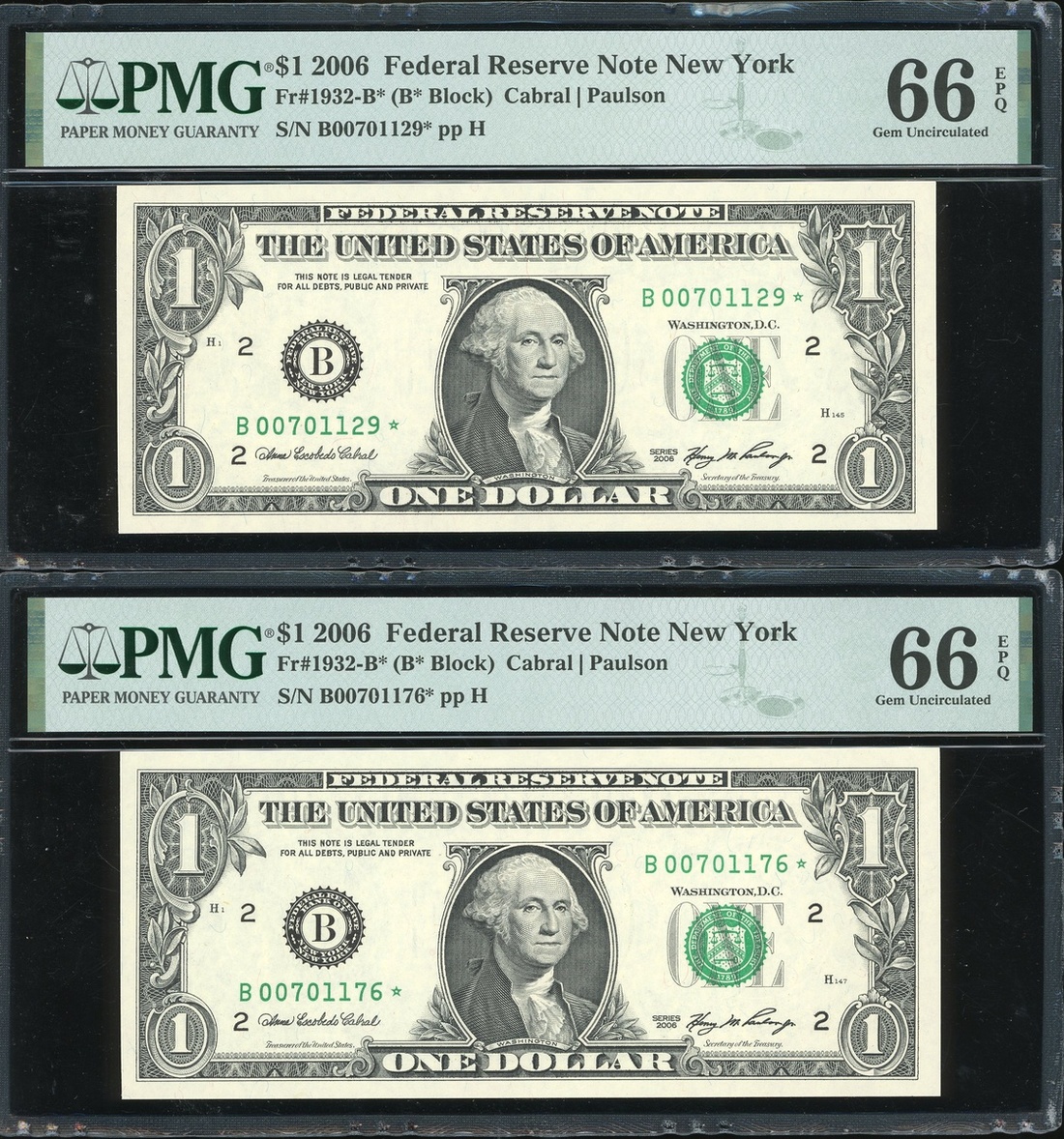 Unites States, Federal Reserve Note New York, a pair of $1, 2006, Cabral / Paulson, serial numbers B00701129* pp H and B00701176* ppH, (Fr# 1932-B*), both graded PMG 66EPQ Gem Uncirculated (2).