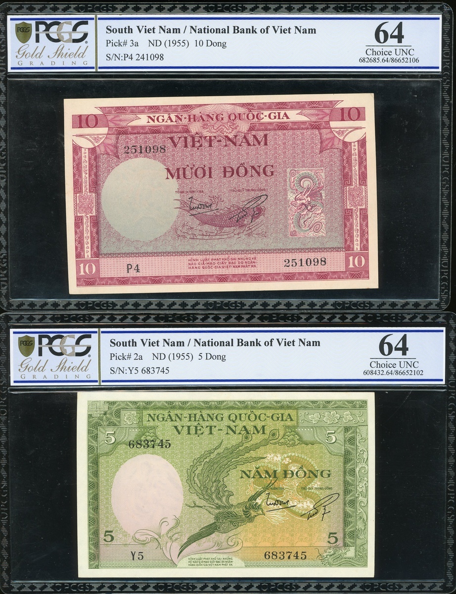 South Vietnam, 1, 5 and 10 Dong, 1955-56, (Pick 1, 2 and 3), all graded PCGS Gold Shield Grading 64 Choice Uncirculated (3)