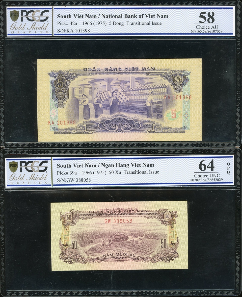 South Vietnam: Transitional Issue, group of 3: 50 xu, 2 dong and 5 dong, 1966, serial numbers GW388058, AY153427 and KA101398,