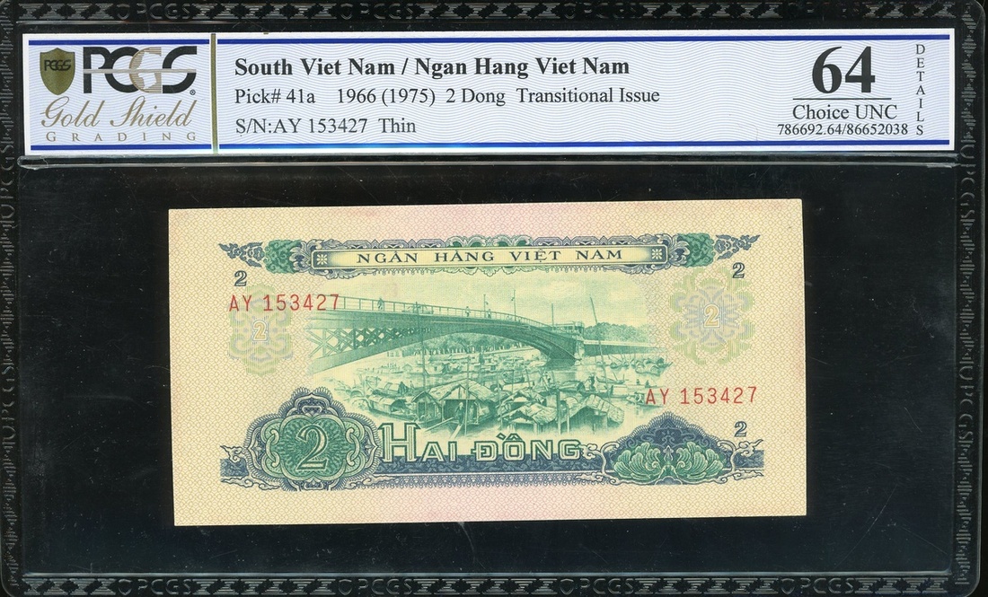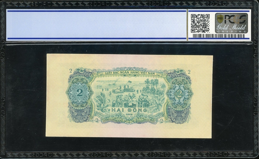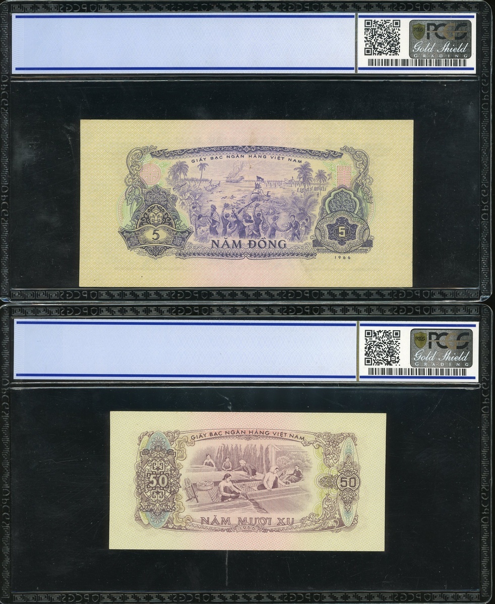 1956年越南紙幣3枚一組,包括5毫,2盾及5盾,編號GW388058,AY153427及KA101398,分別評PCGS Gold Shield 64OPQ,64有薄,及58