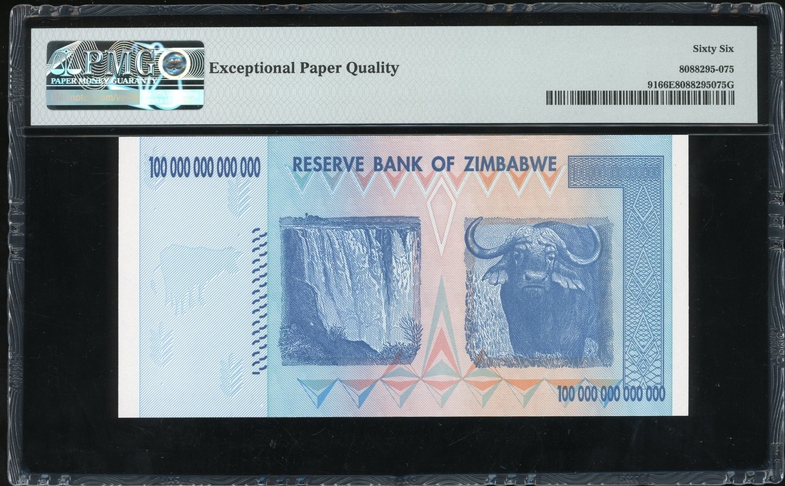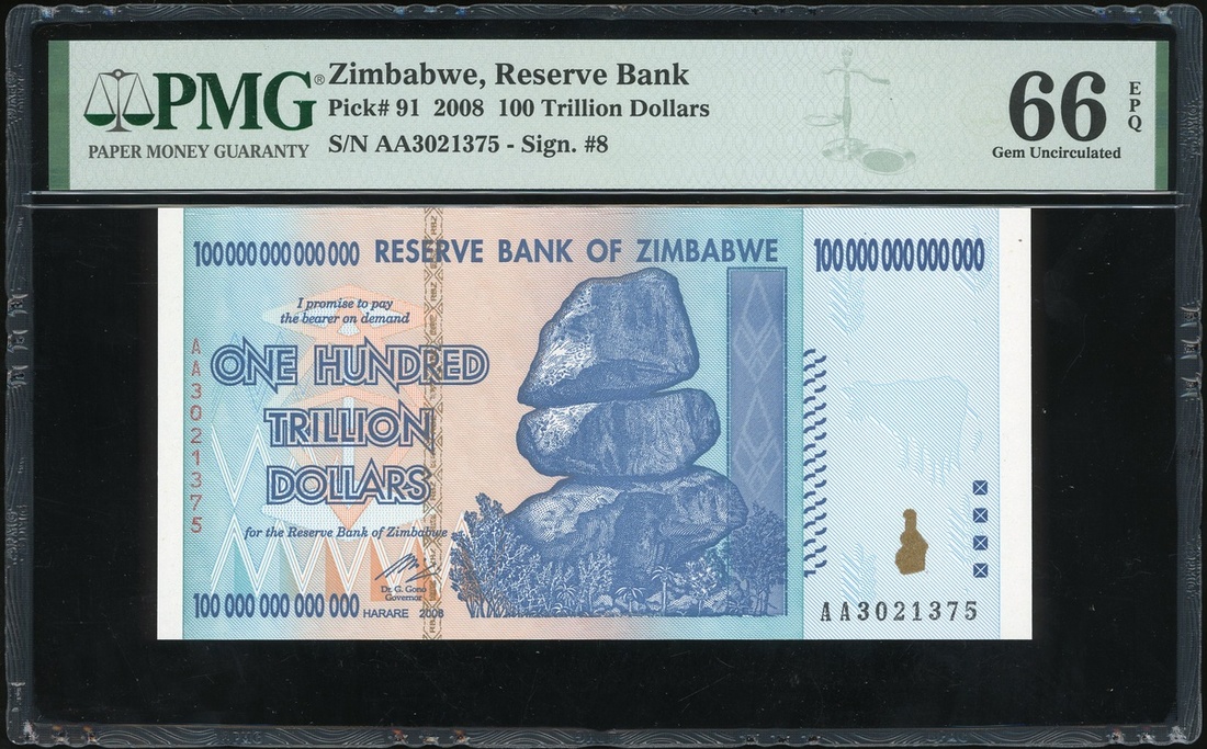 Zimbabwe: Reserve Bank, 100 trillion dollars, 2008, serial number AA3021375, (Pick 91), PMG 66EPQ Gem Uncirculated