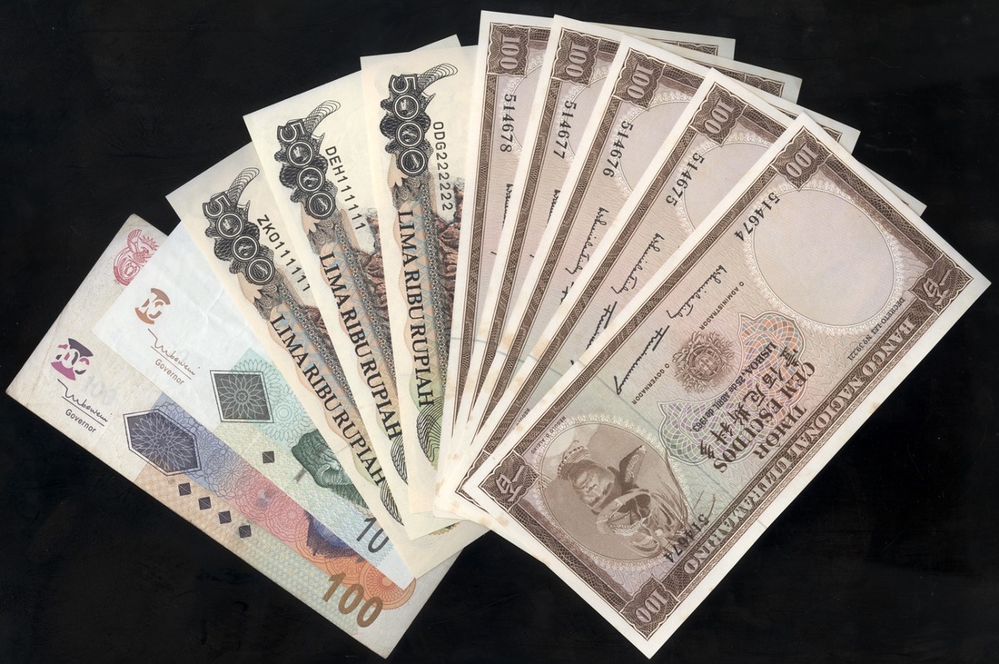 Mixed World Notes, a group of 10 notes consisting 5 consecutive 100 escudos of Banco Nacional Ultramarino(Timor), 1963, serial number 514674-8, 10 and 100 rand of South African Reserve Bank, ND, serial number EB9204905A and DR5270374D, a trio of 5000 rupiah of Bank Indonesia, all with solid serial number DEH111111, ZKO111111, ODG222222,