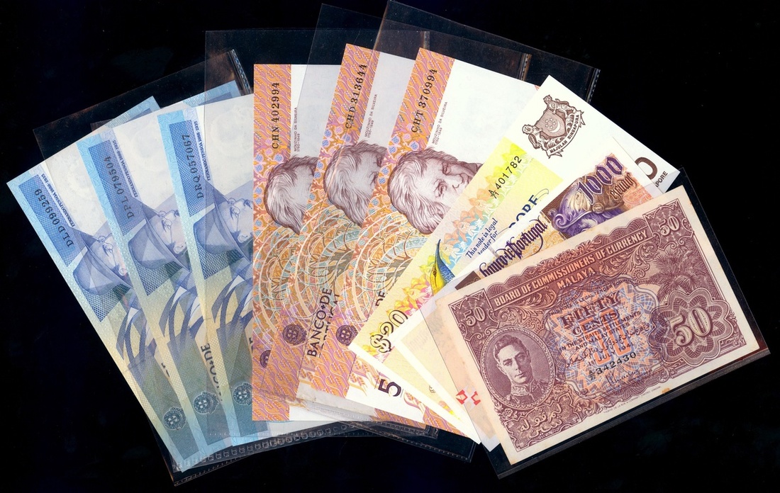 group of 9 notes comprising of Portugal 100 Escudos , 500 Escudos and 1000 Escudos, Singapore $20, 1976 and Malaya 50 cents, 1941,