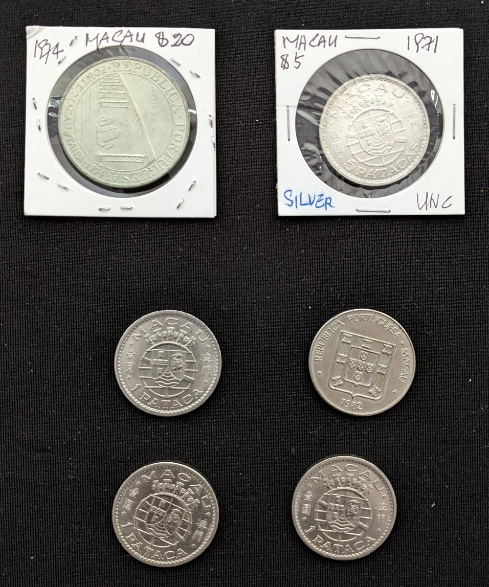 Macau, a group of 6 coins, consists of 4x 1 patacas, 1x 5 patacas and 1x 20 patacas, Ponte Macau on reverse, 1968-1982, about uncirculated or so (6).