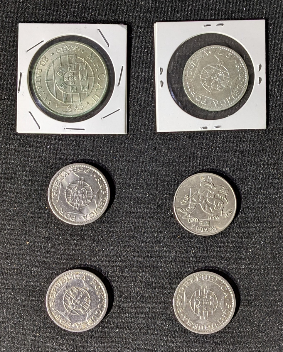 1968-1982年澳門錢幣一組6枚,包括1元4枚,5元1枚及20元1枚,約AU