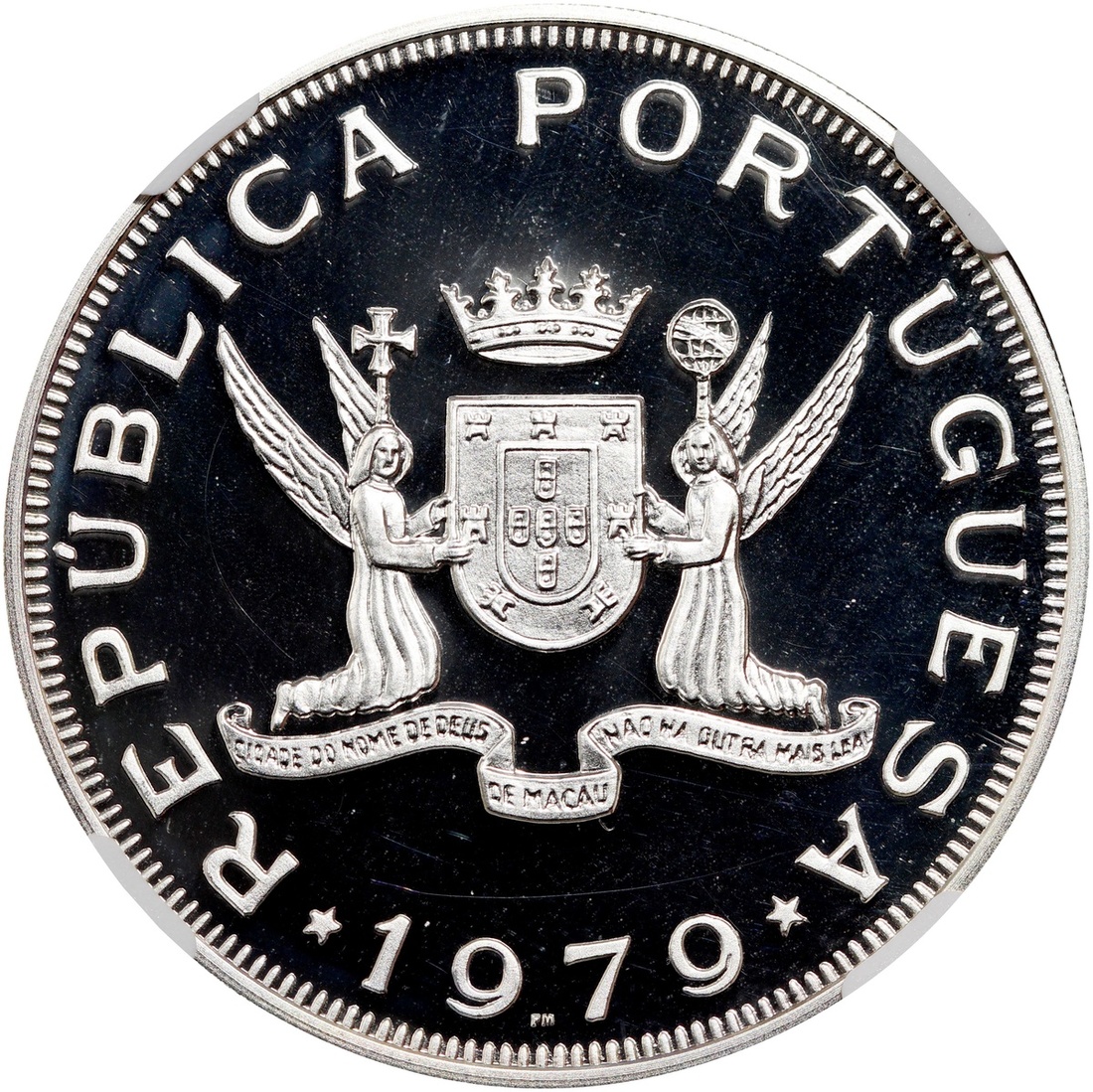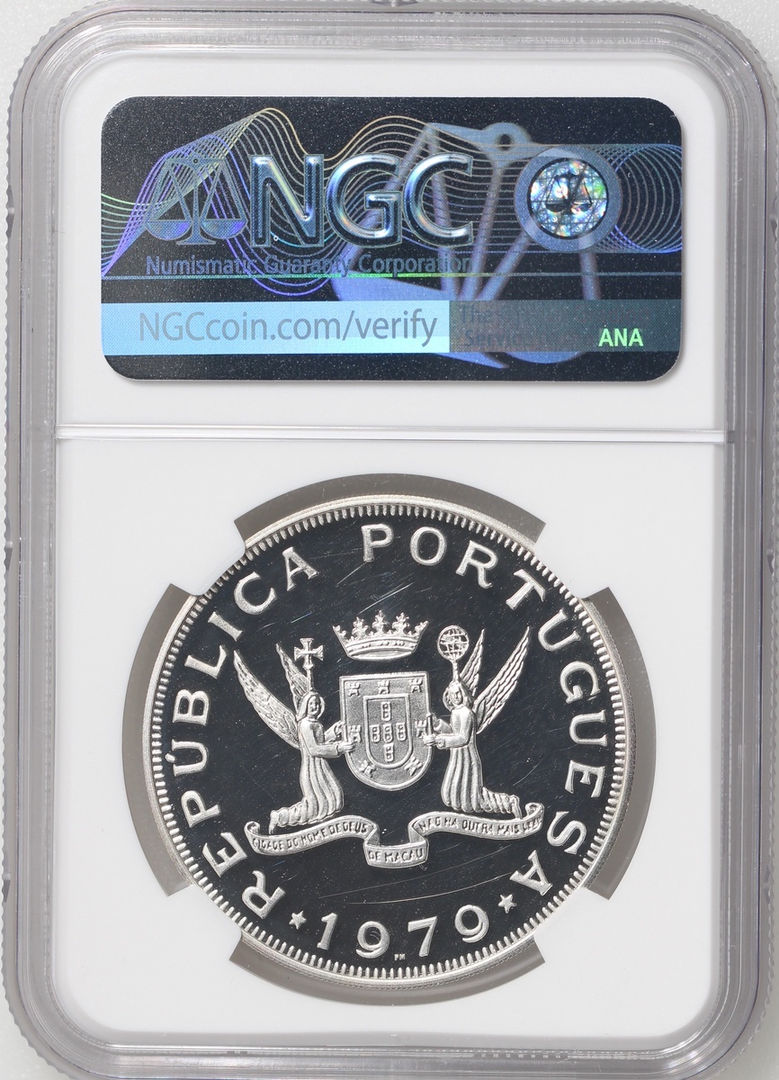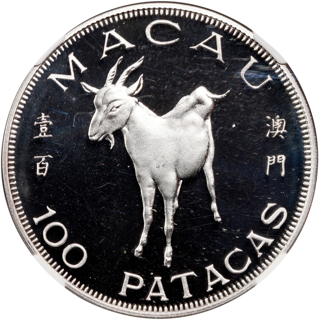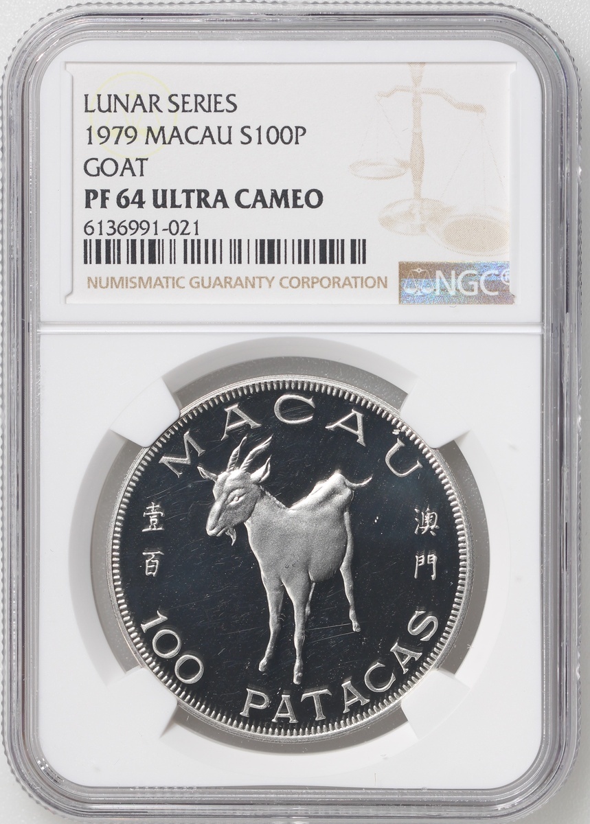 1979年澳門首版十二生肖羊年精鑄銀幣100元,重28.28克,NGC PF 64 Ultra Cameo,澳門首枚十二生肖主題之錢幣,珍罕,#6136991-021
