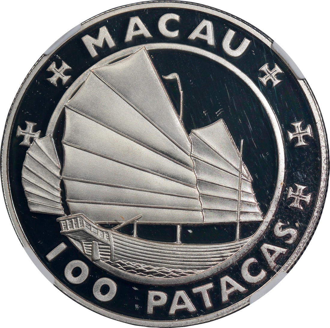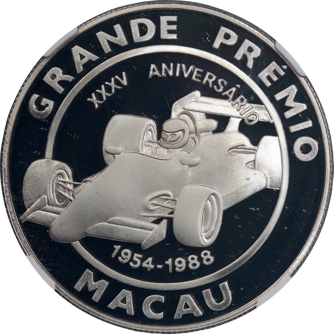 Macau, silver proof 100 patacas, 1988, commemoirative issue for the 35th Anniversary of the Grand Prix, ASW 0.84oz, with original certificate and packaging, mintage of 5000 pieces, NGC PF 68 Ultra Cameo, Cert. #6469573-018