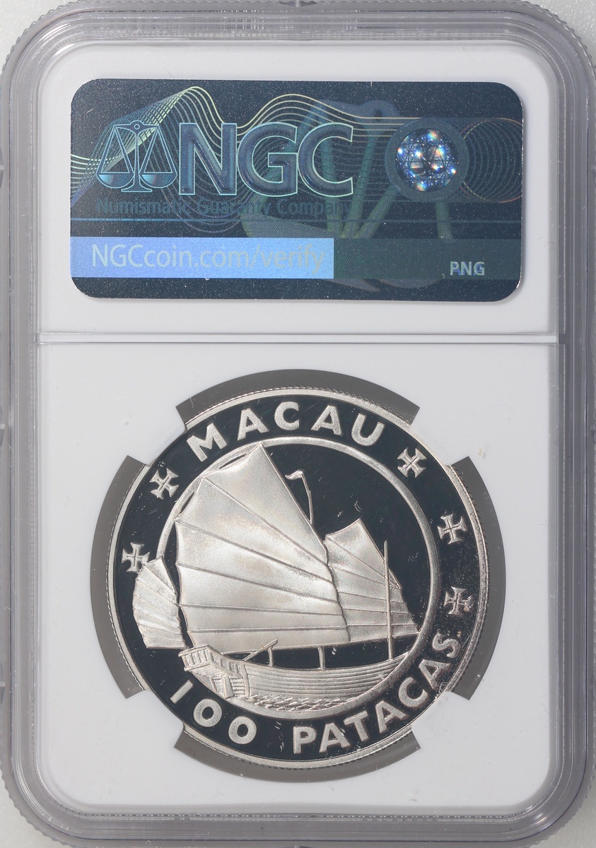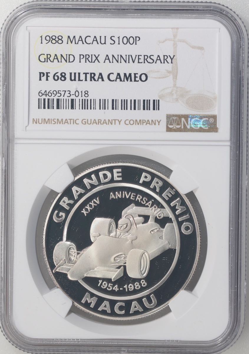 1988年澳門精鑄銀幣100元,格蘭披治大賽車35周年紀念,總含銀量0.84安士,附證書及原盒,發行量5000枚,NGC PF 68 Ultra Cameo,#6469573-018
