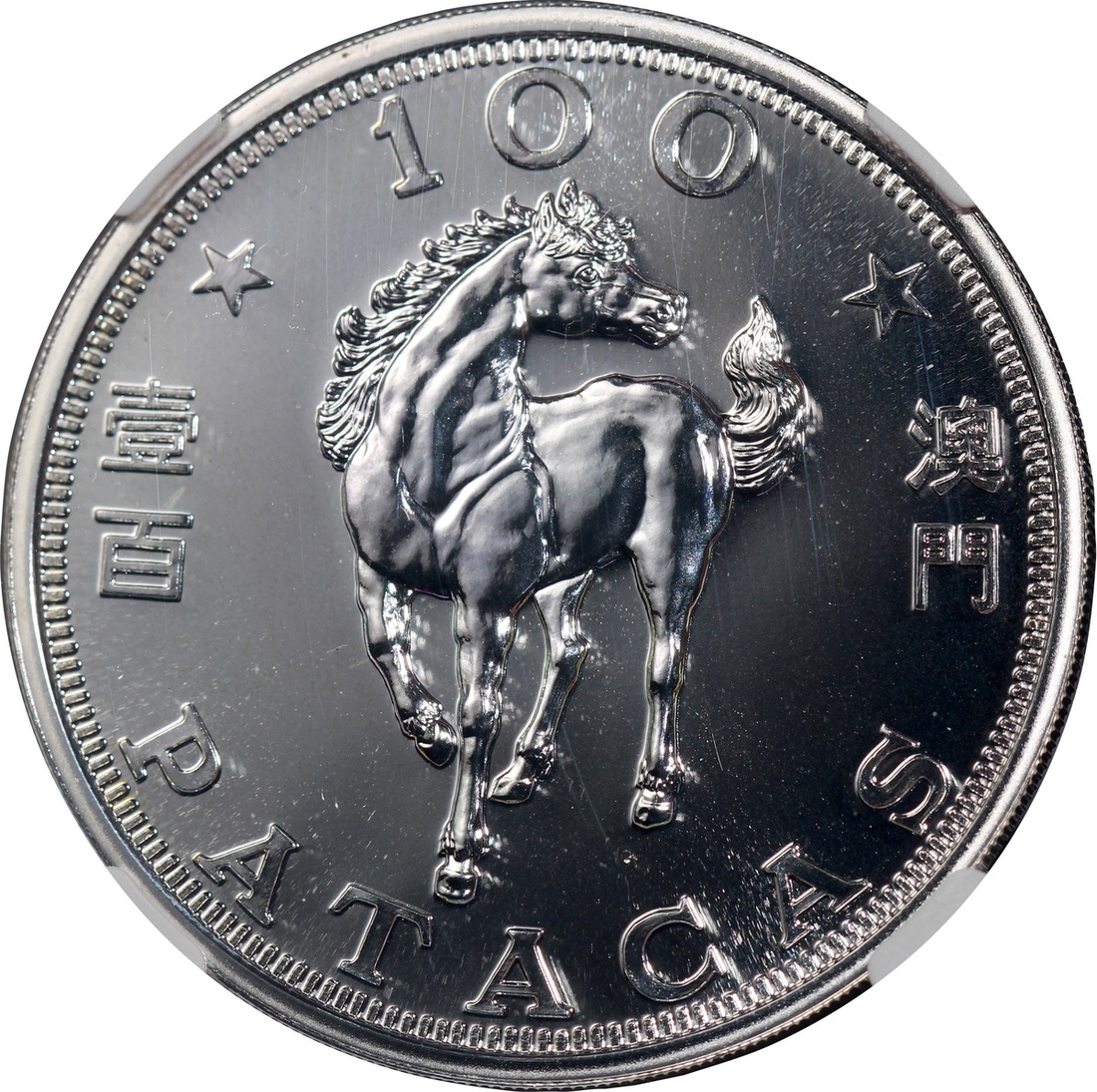 Macau, silver 100 patacas, 1990, Year of the Horse, ASW 0.84oz, NGC MS 68 Cert. #6469573-013
