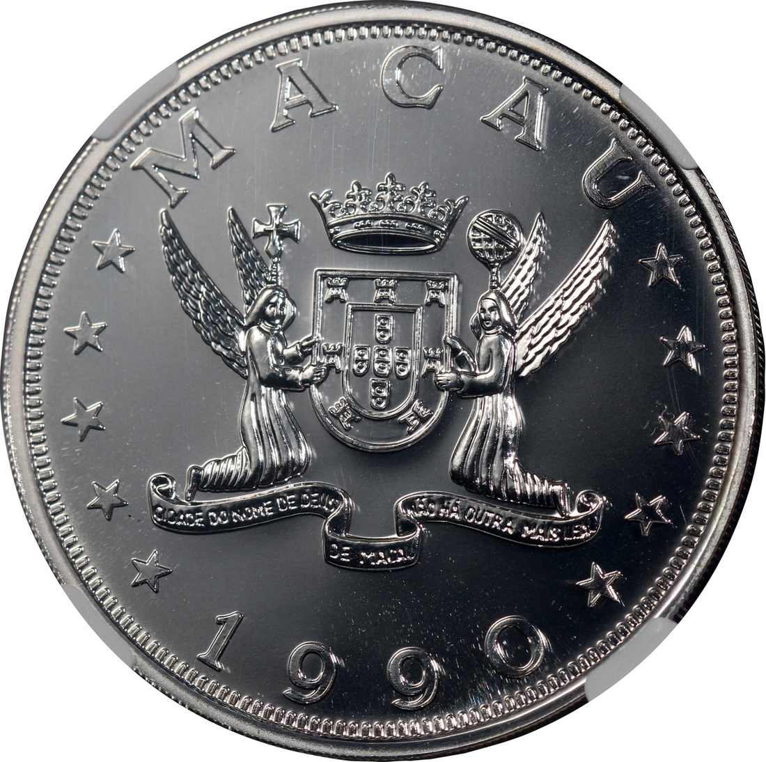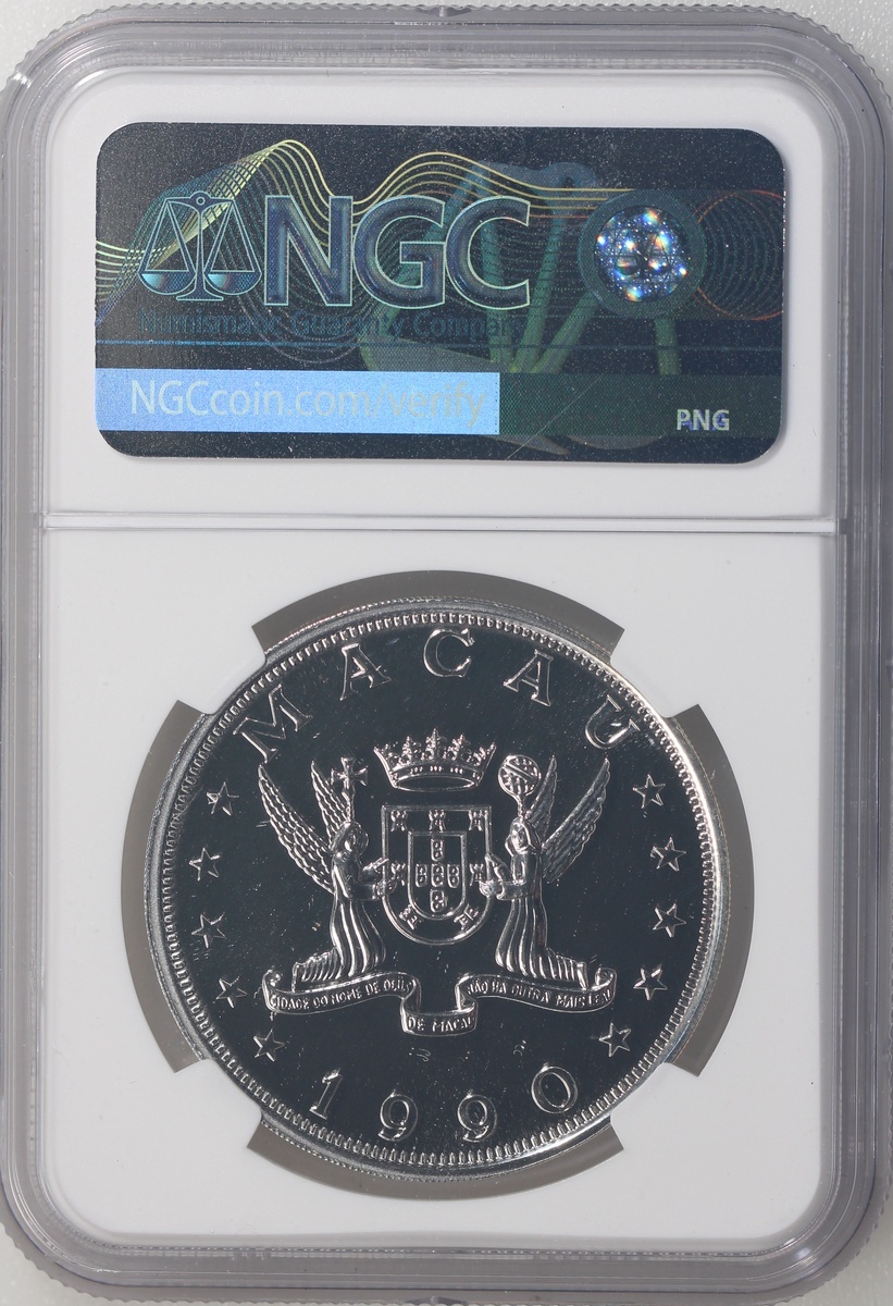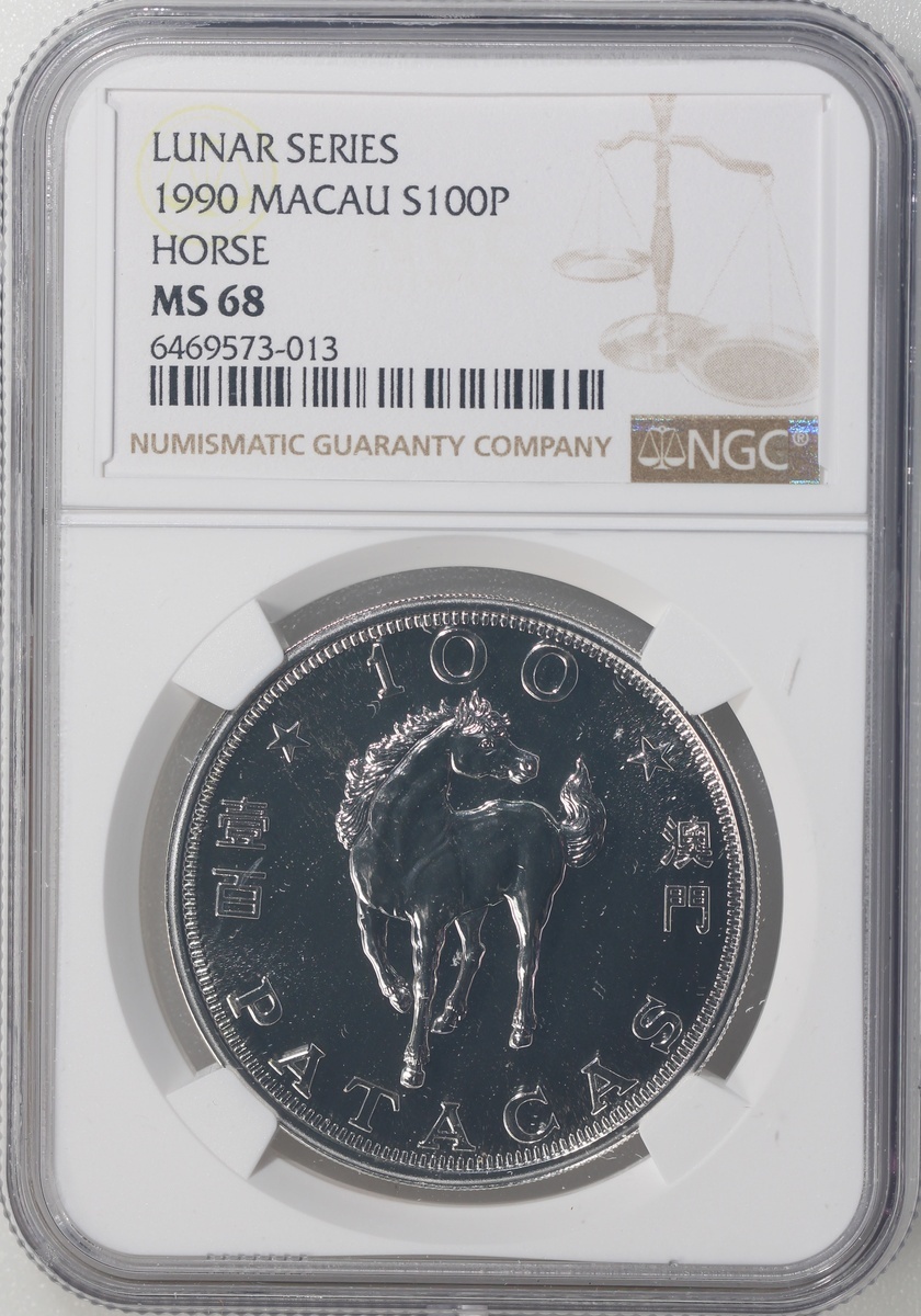 1990年澳門馬年生肖紀念銀幣100元,總含銀量0.84安士,NGC MS 68,#6469573-013