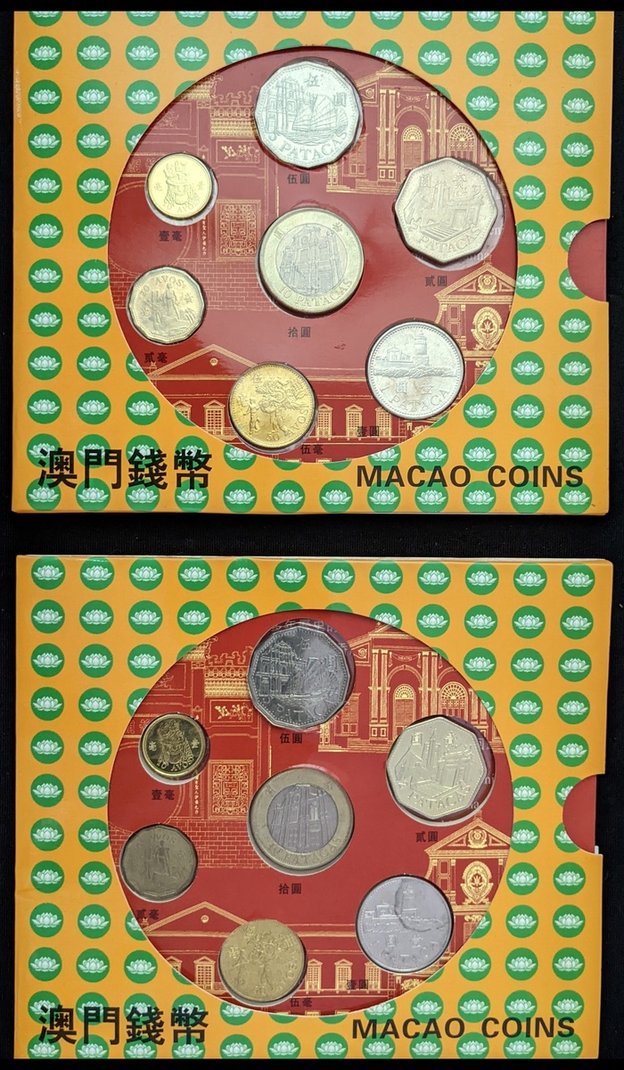 Macao Coins Set, a group of 2 sets, each set contains 10 , 20 and 50 avos, 1, 2, 5 and 10 patacas, 1993-2007, uncirculated (2 sets)