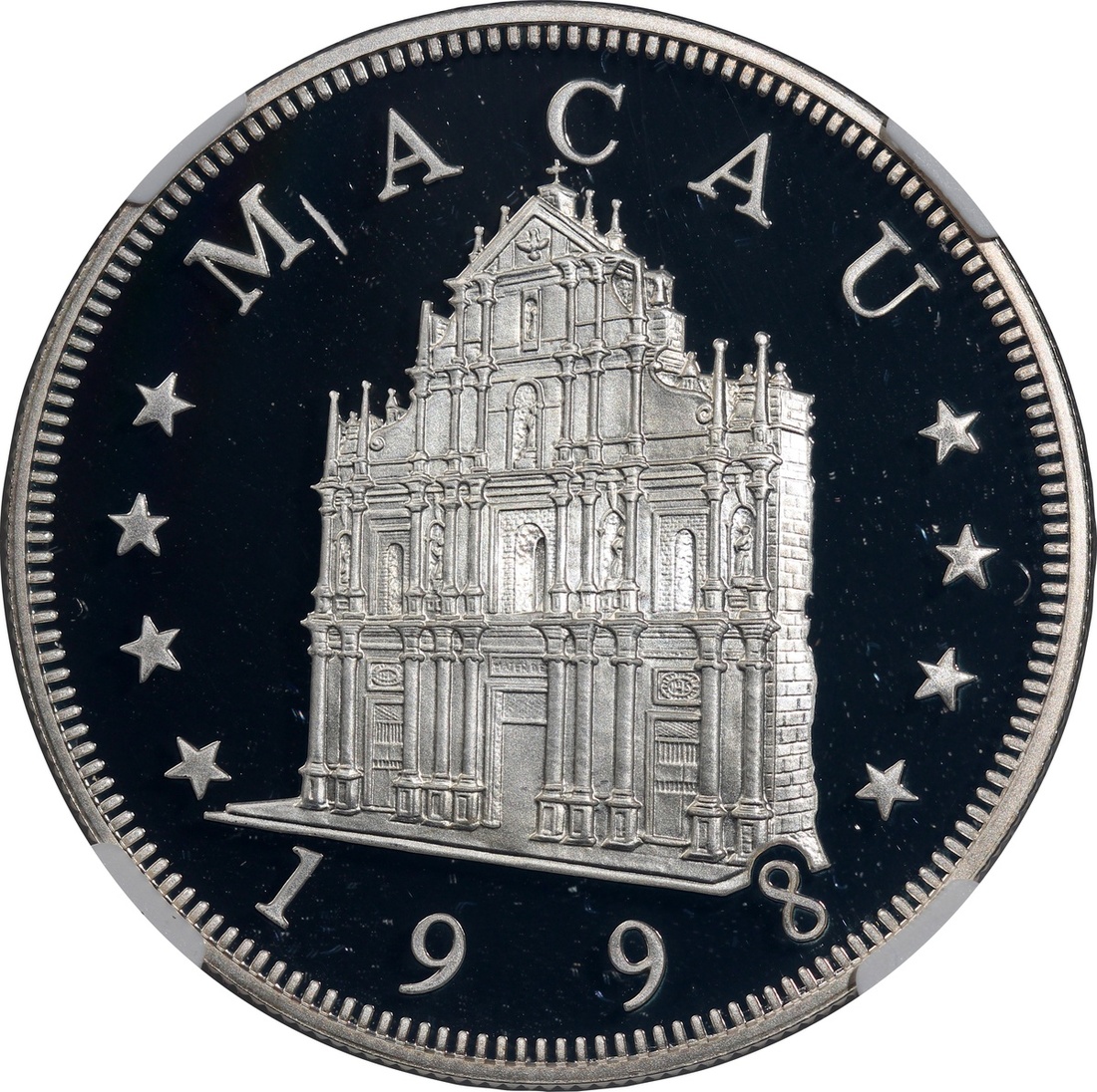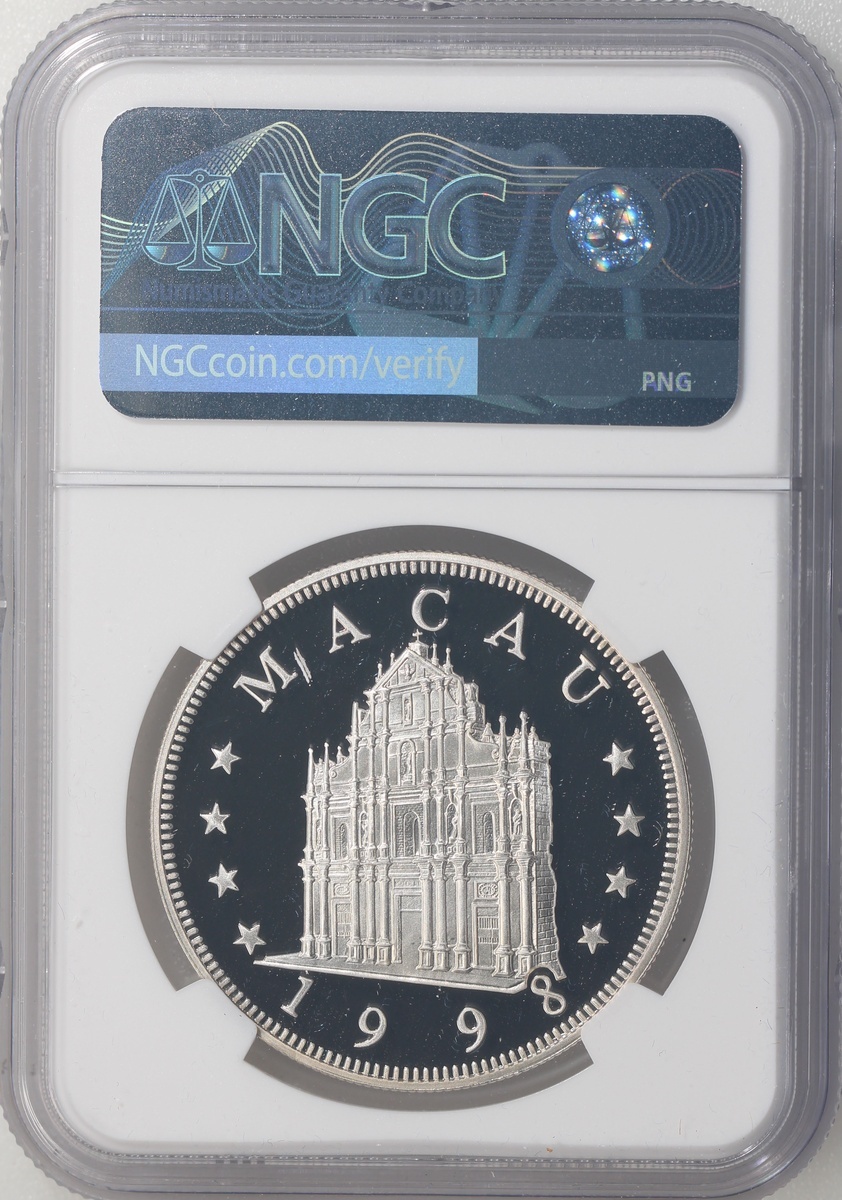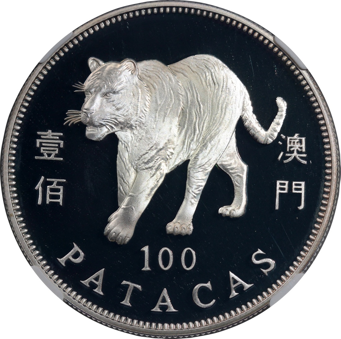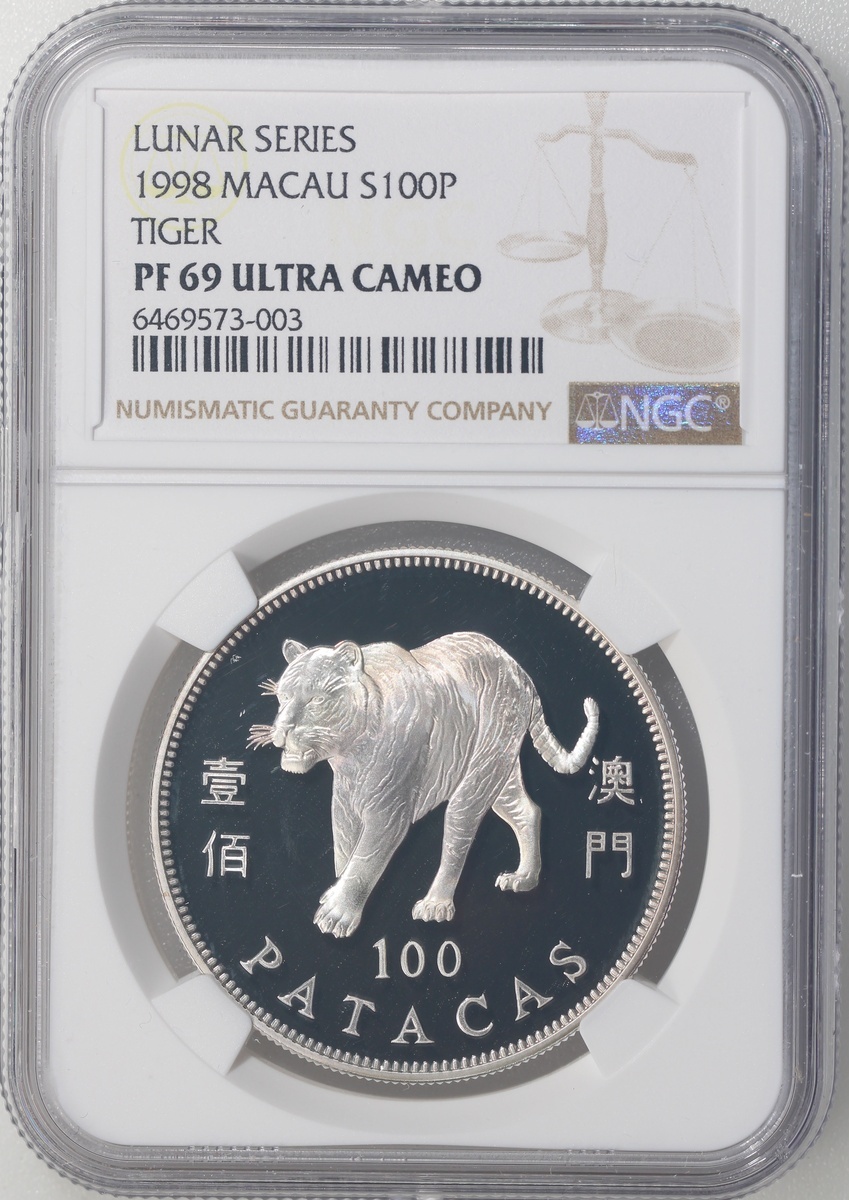 1998年澳門虎年生肖精鑄銀幣100元,總含銀量0.84安士,附證書及原盒,NGC PF 69 Ultra Cameo,#6469573-009