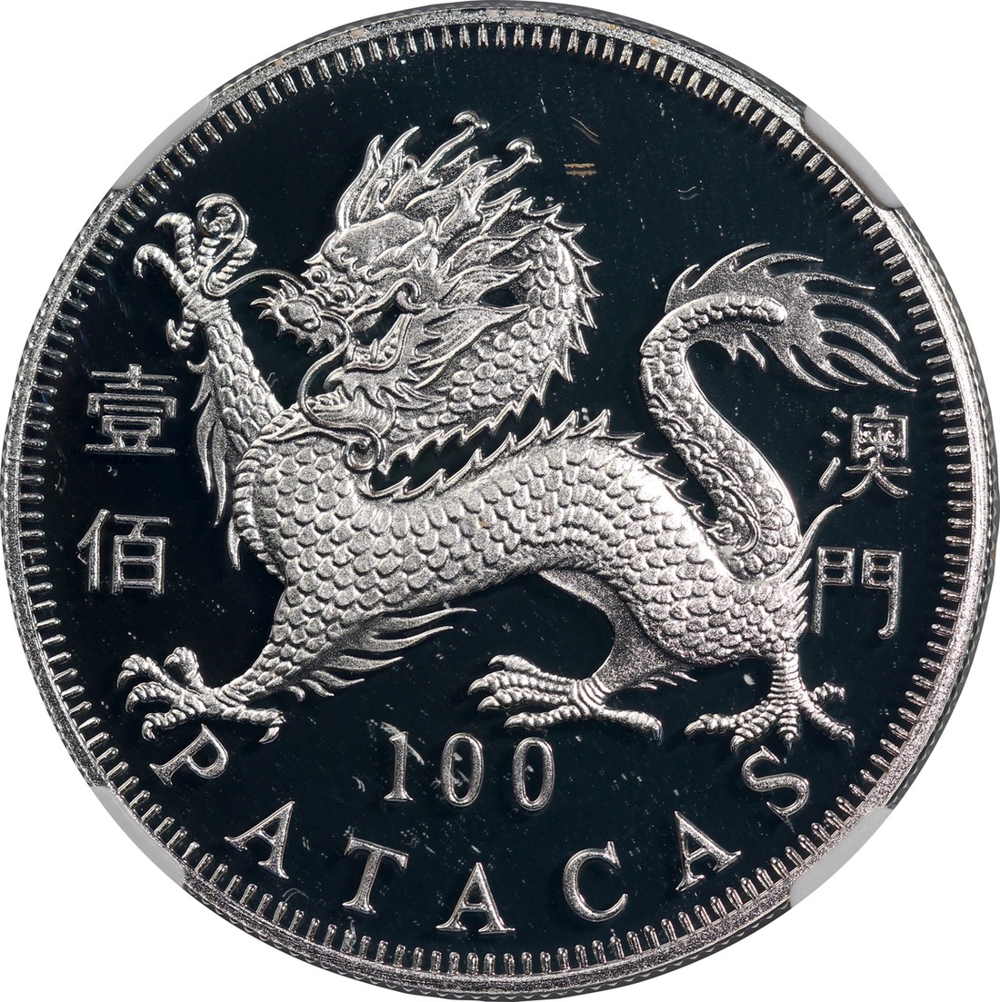 Macau, silver proof 100 patacas, 2000, Year of the Dragon, ASW 0.84oz, with original certification and packaging, NGC PF 69 Ultra Cameo, Cert. #6469573-004