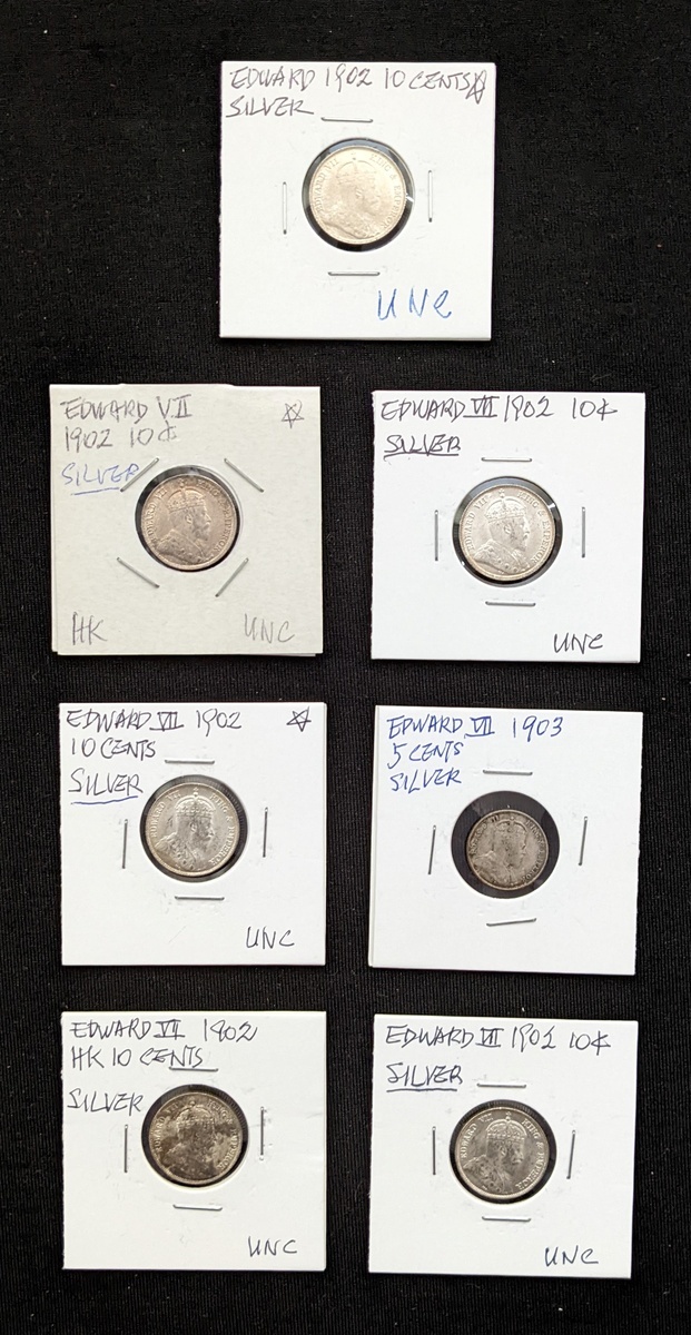 Hong Kong, a group of 7 silver coins, consists of 1x 5 cents, 1903, and 6x 10 cents, 1902, fine to extremely fine, several with toning, viewing recommended (7).