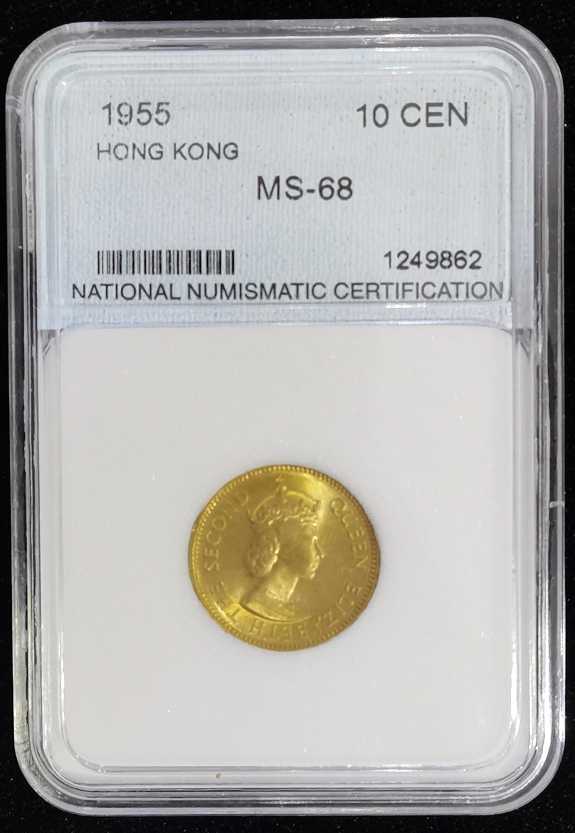 Hong Kong, 10 cents, 1955, NNC MS68, with original lustre, #1249862.
