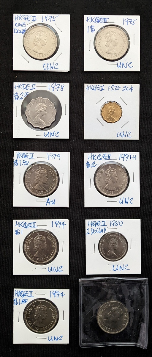 香港錢幣10枚一組,包括1975年2毫,1971-H至1980年1元8枚,及1978年2元1枚,均UNC帶原光