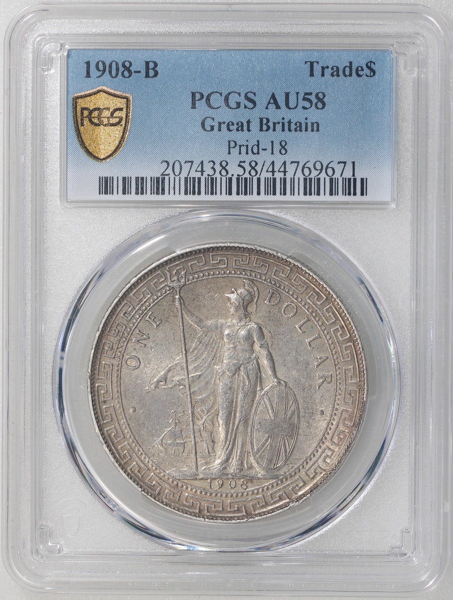 Great Britain, silver trade dollar, 1908-B, (Prid-18), PCGS AU58, Cert. #44769671