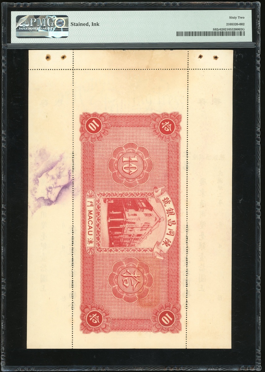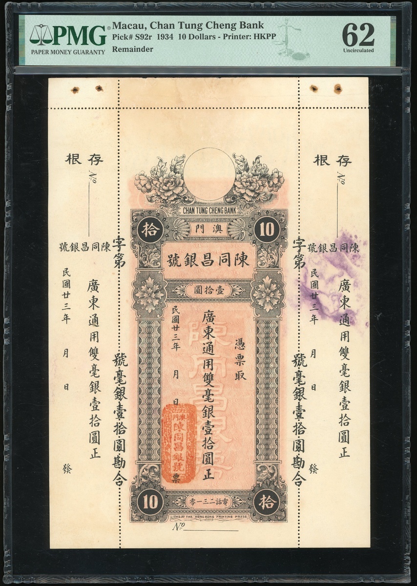 1934年澳門陳同昌銀號10元庫存票,附存根,PMG 62,有墨漬