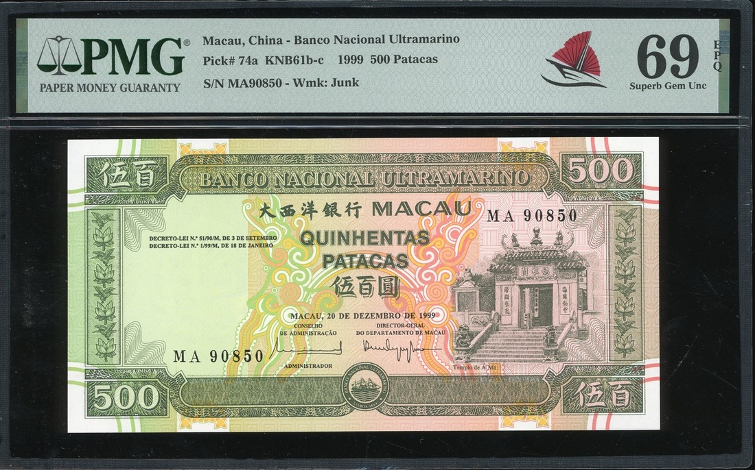 Macau, Banco Nacional Ultramarino, 500 patacas, 20.12.1999, serial number MA90850, (Pick 74a), PMG 69EPQ Superb Gem Ucirculated. One of three notes in this second highest grade in the PMG population report with only one note graded higher. A choice example.