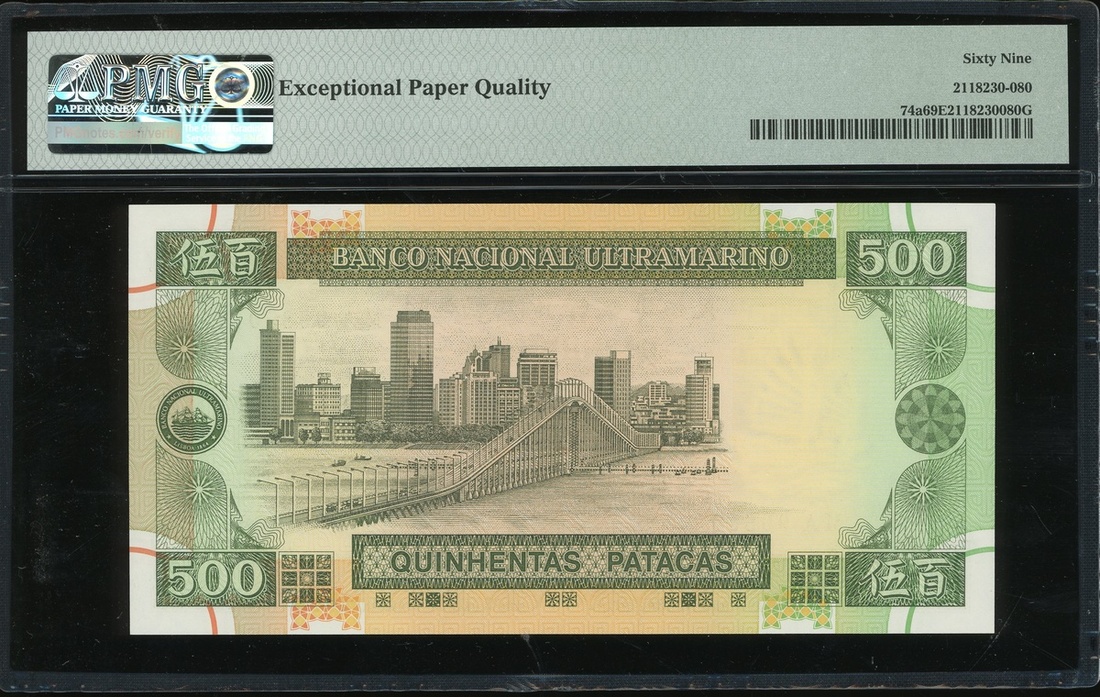 1999年澳門大西洋海外匯理銀行500元,編號MA90850,PMG 69EPQ,PMG報告中的亞軍分,與另外兩枚同分,僅一枚更高分