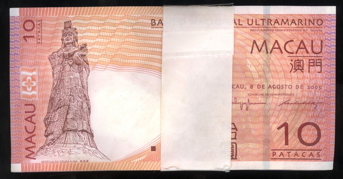 Macau, Banco Nacional Ultramarino, a bundle of 100x 10 patacas, 2005, serial numbers AA449401-500, (Pick 80a), uncirculated (100).