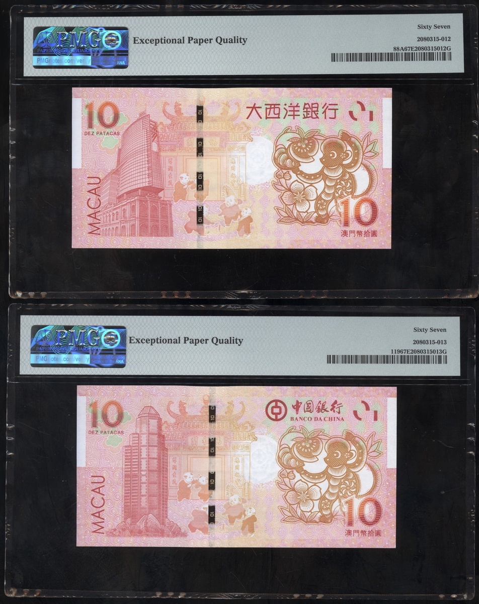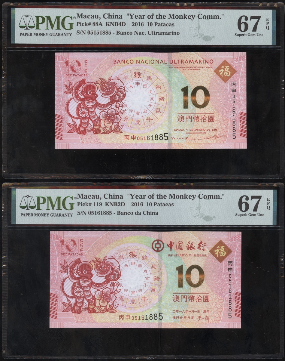 Macau: Banco Nacional Ultramarino and Banco de China, a pair of 'Year of the Monkey Commemorative' 10 patacas, 2016, identical serial number 05161885, (Pick 88A and 119), both graded PMG 67EPQ Superb Gem Uncirculated (2).