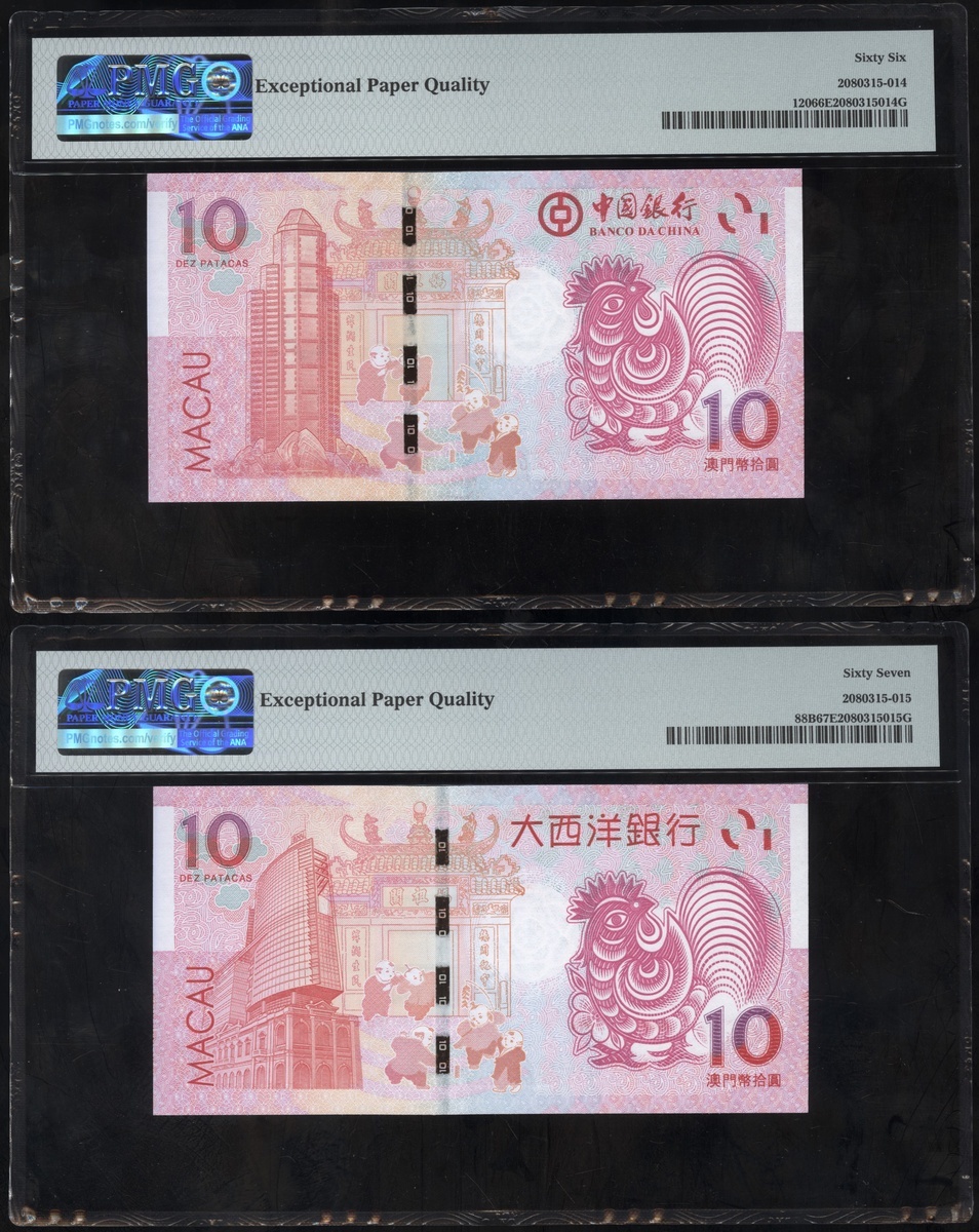 Macau: Banco Nacional Ultramarino and Banco de China, a pair of 'Year of the Rooster Commemorative' 10 patacas, 2016, identical serial number 08921713, (Pick 88B and 120), graded PMG 67EPQ and 66EPQ respectively (2).