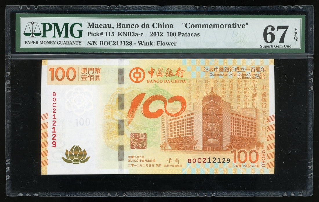 Macau: Banco Da China, $100, 5.2.2012, serial number BOC212129, issued to commemorate the 100th Anniversary of the Bank of China in Macau, (Pick 115), PMG 67EPQ Superb Gem Uncirculated