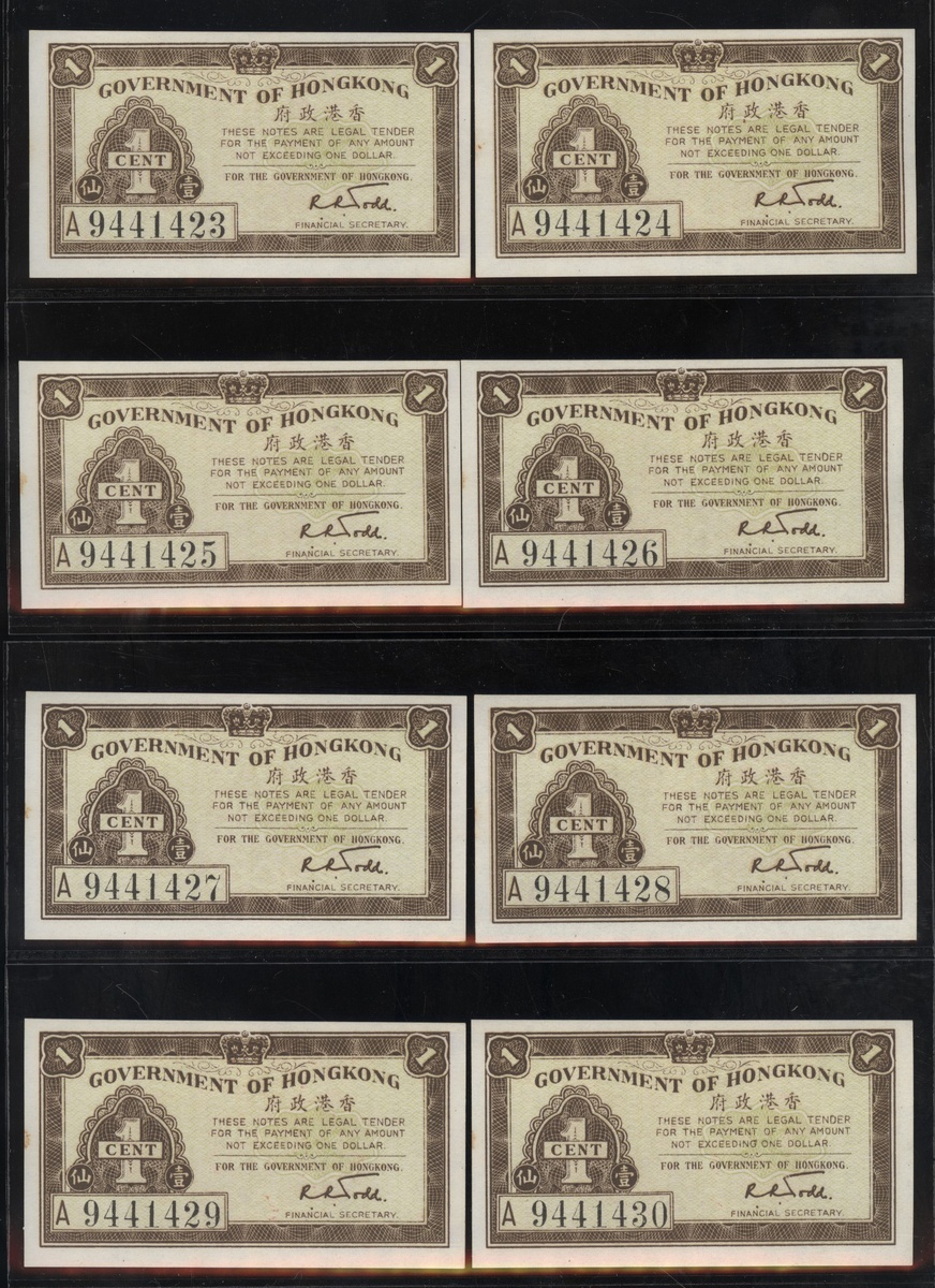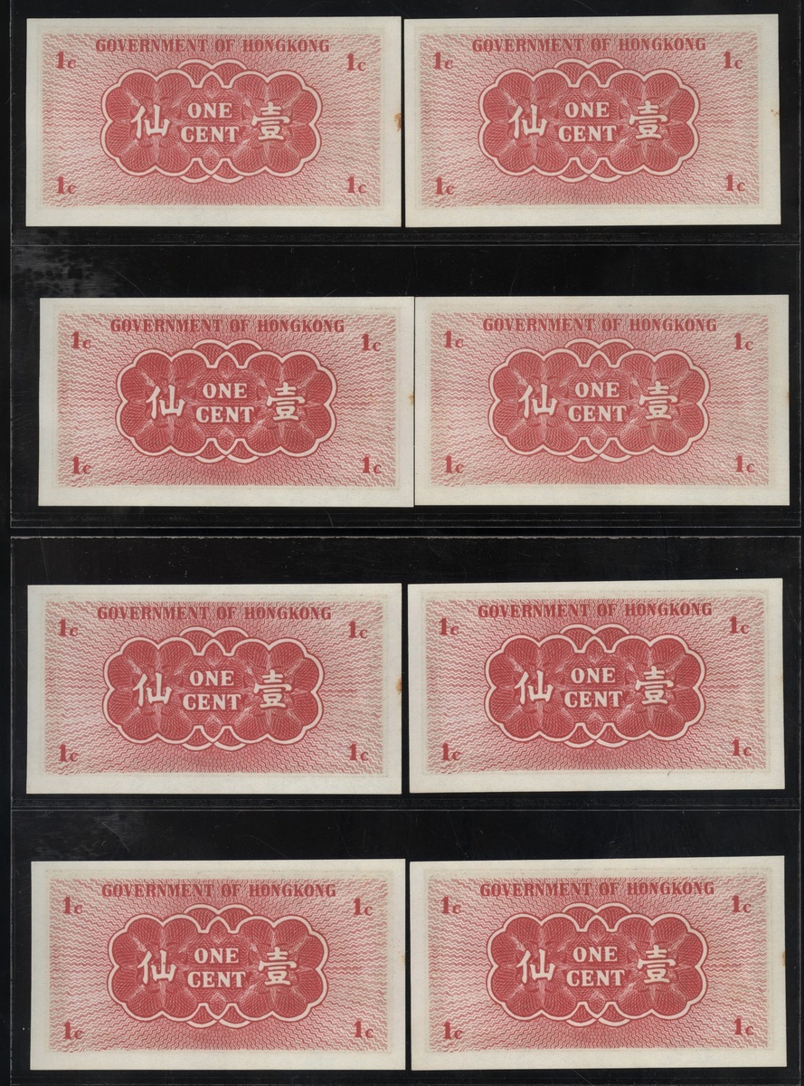 1941年香港政府壹仙八枚連號,編號A9441423至A9441430,均UNC,建議預覽(8)