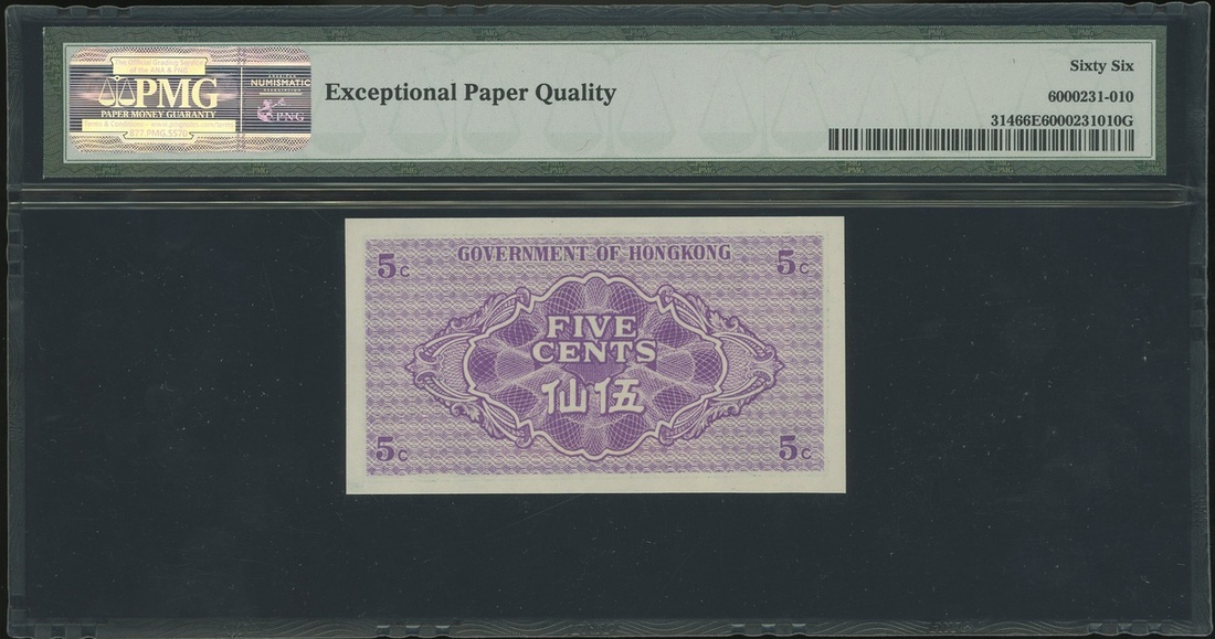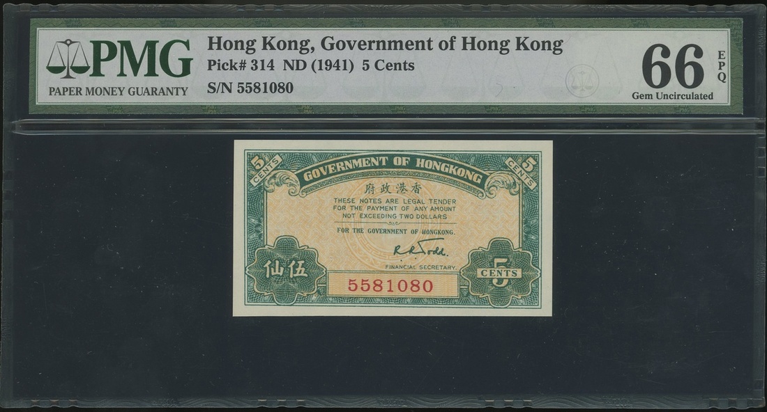 Government of Hong Kong, 5 cents, ND (1941), serial number 5581080, (Pick 314), PMG 66EPQ Gem Uncirculated