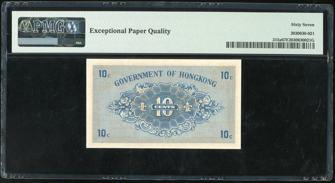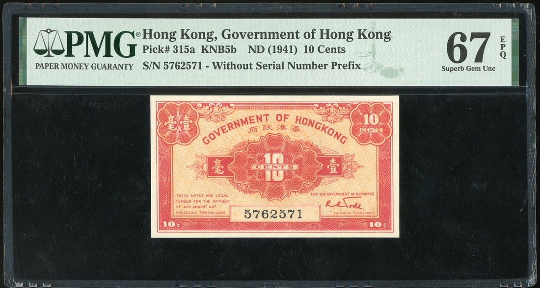 Governement of Hong Kong, $10 cents, ND(1941), serial number 5762571, (Pick 315a), PMG 67EPQ Superb Gem Uncirculated, the second highest grade in PMG population report, only 6 notes are in higher grade.