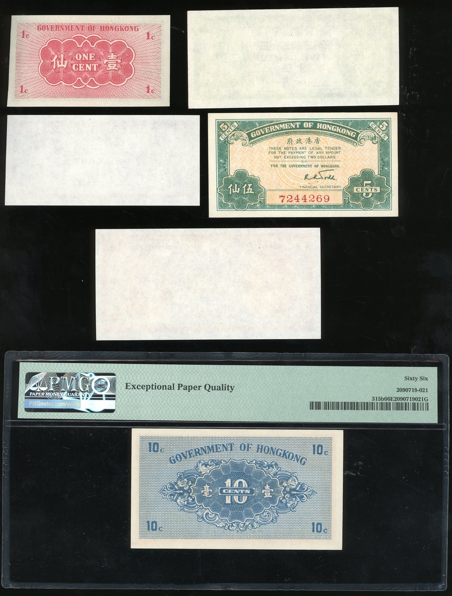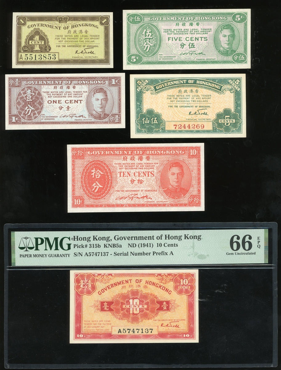 1941/45年香港政府一組六枚1仙,5仙及1毫,每個年份及面值各一枚,其中1945年發行的都沒有編號,而1941年的編號分別為A5513853,7244269及A5747137,41年1毫評PMG 66EPQ,其他大約UNC品相