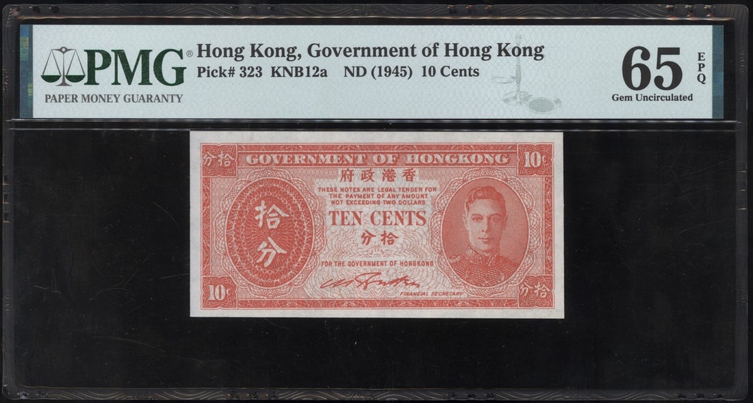 Government of Hong Kong, 10 cents, ND (1945), (Pick 323), PMG 65EPQ Gem Uncirculated