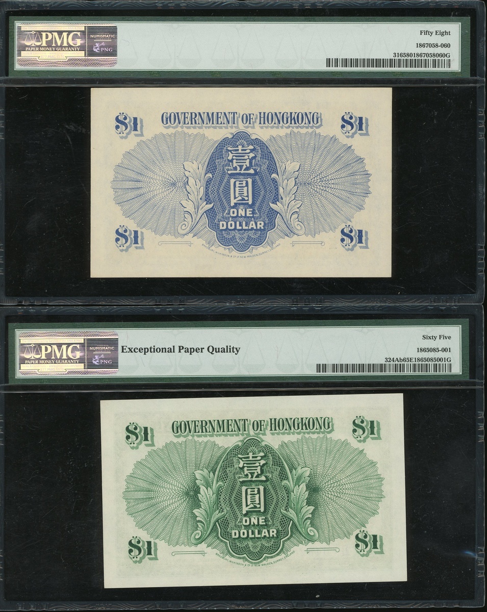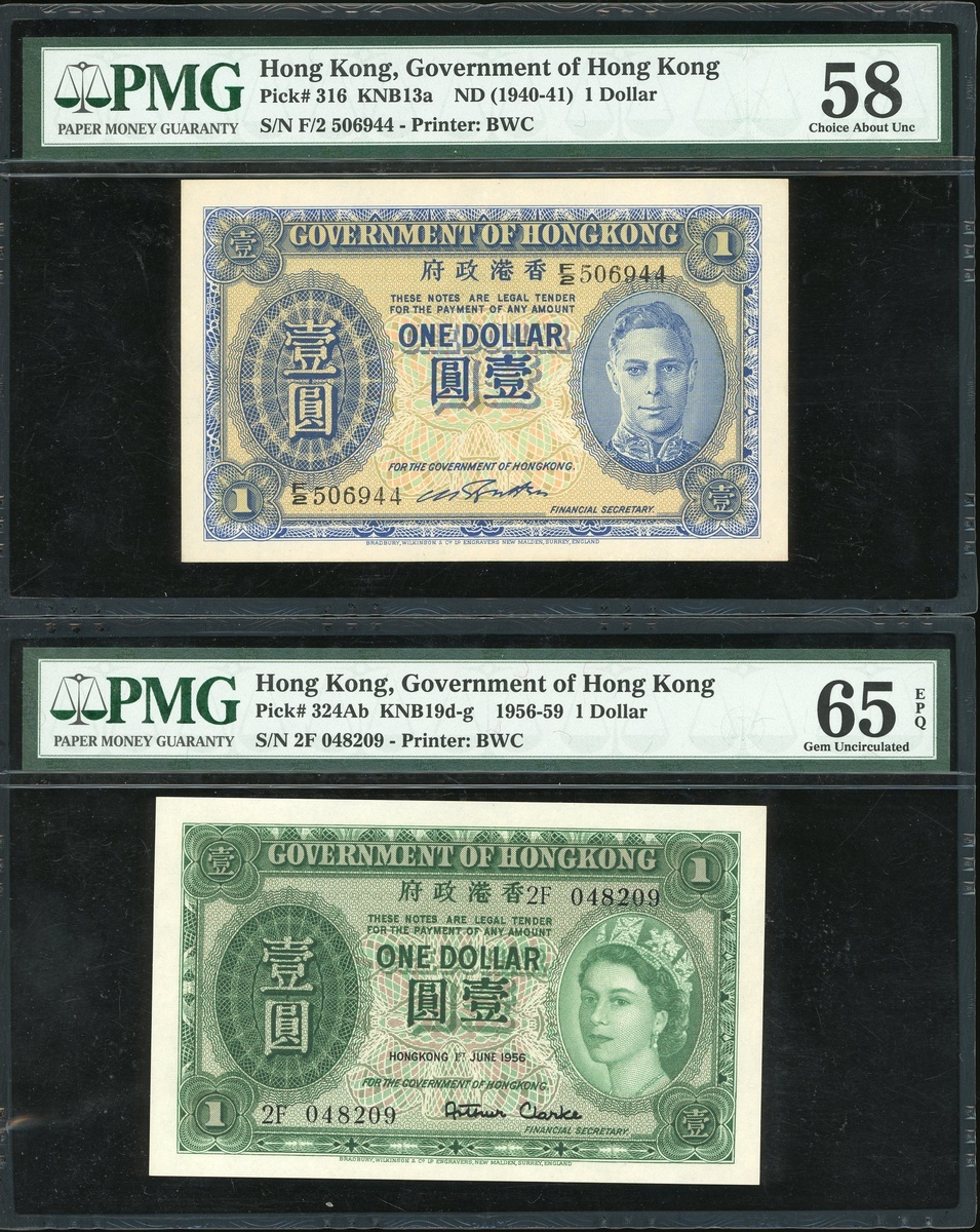 Government of Hong Kong, lot of 2x $1, 1940 and 1956, #F/2 506944 and 2F 048209, (Pick 316 and 324Ab), PMG 58 and 65EPQ respectively (2)