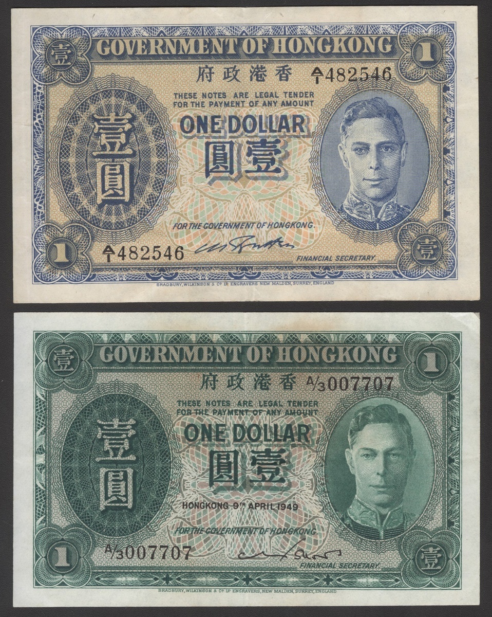Government of Hong Kong, a pair of 1 Dollar, ND(1940-41) and 9.4.1949, serial numbers A/1 482546 and A/3 007707, blue and green respectively, George VI at right, (Pick 316, 324b), good very fine to extremely fine, viewing highly recommended, sold as is, no returns (2)