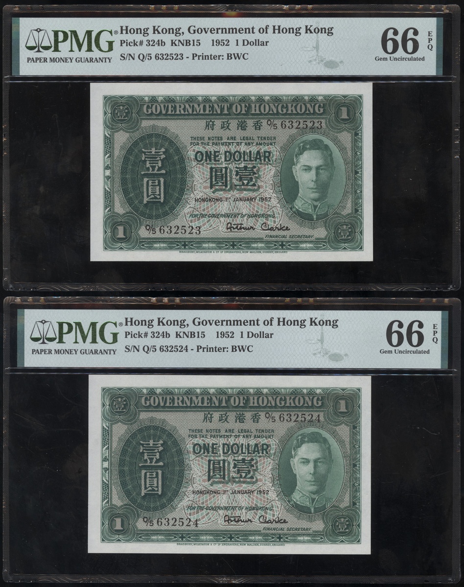 1952年香港政府1元兩枚連號,編號Q/5 632523-632524,均PMG66EPQ(2)