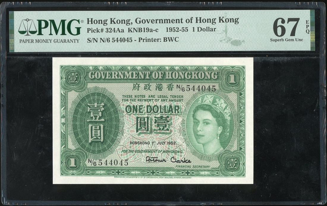 Government of Hong Kong, $1, 1.7.1952, serial number N/6 544045, (Pick 324Aa), PMG 67EPQ Superb Gem Uncirculated, the second grade in PMG population report.
