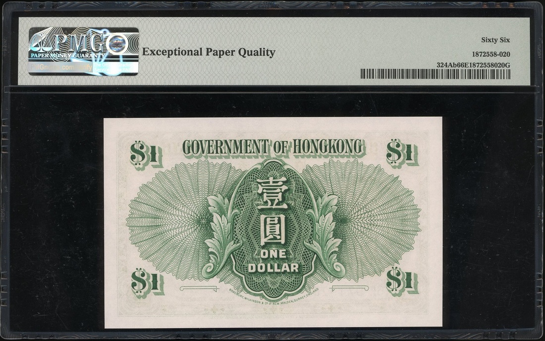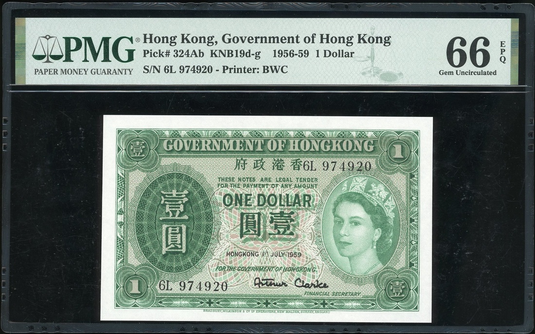 Government of Hong Kong, $1, 1.7.1959, serial number 6L 974920, (Pick 324Ab), PMG 66EPQ Gem Uncirculated.