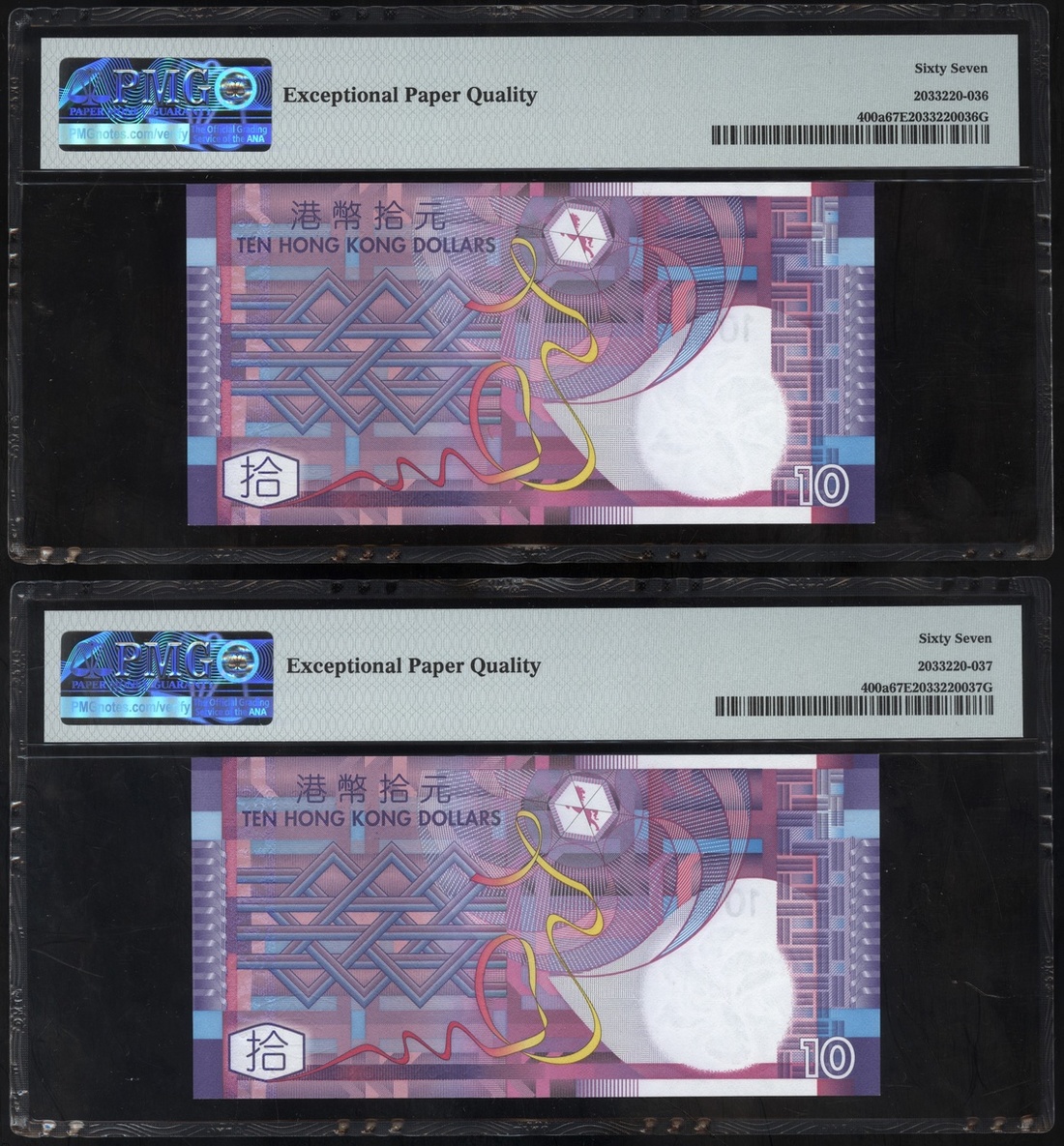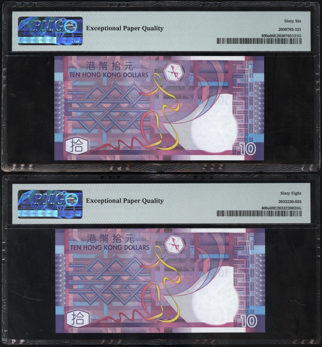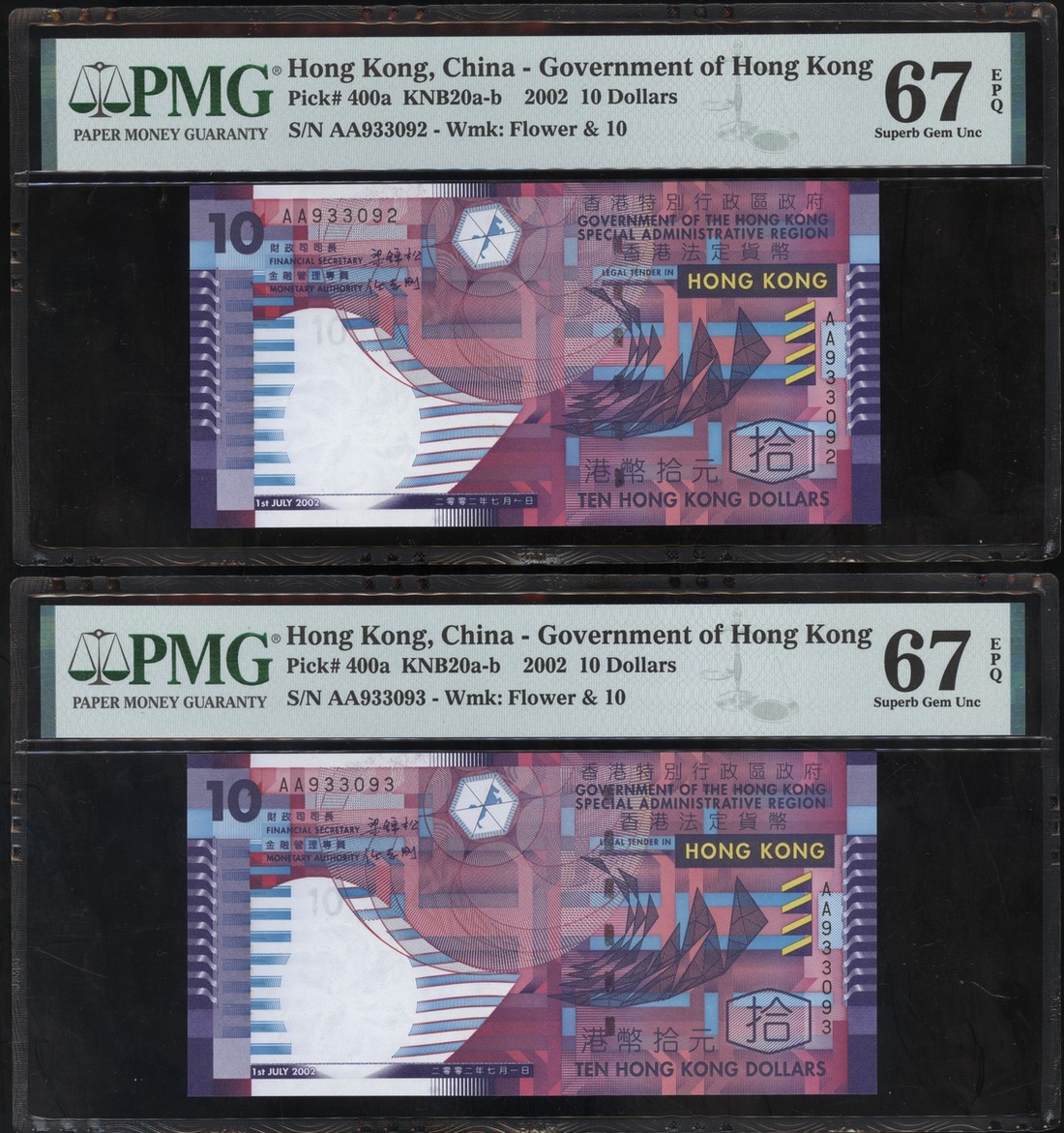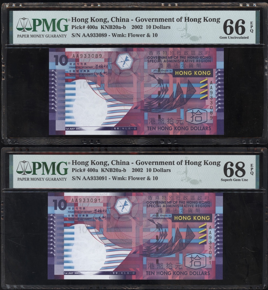 2002年香港政府10元連號四枚,編號AA933089至93,分別評PMG 66EPQ, 68EPQ, 67EPQ 及 67EPQ