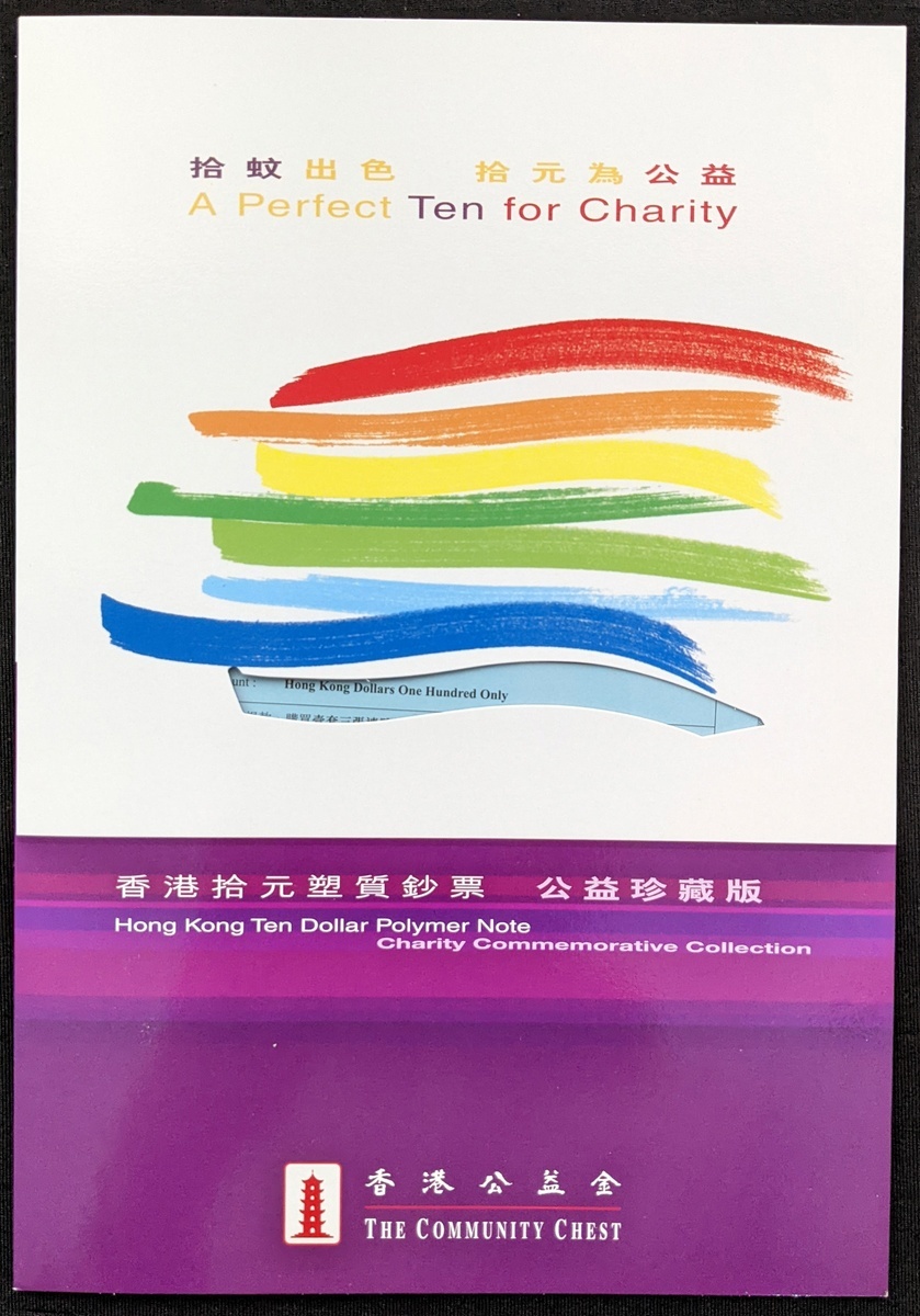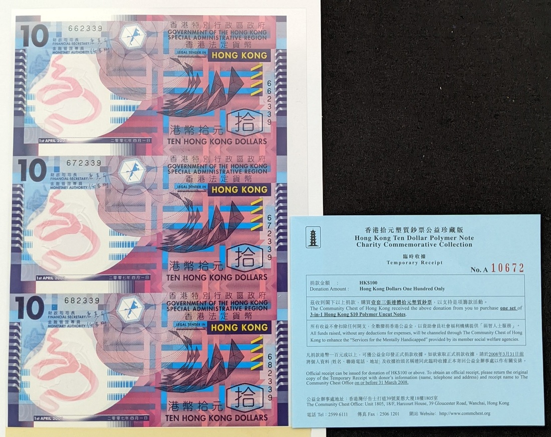 2002年香港新鈔票公益珍藏10元三連體,編號662/672/682339,UNC,連原裝紙套及單據,證書編號 A10672