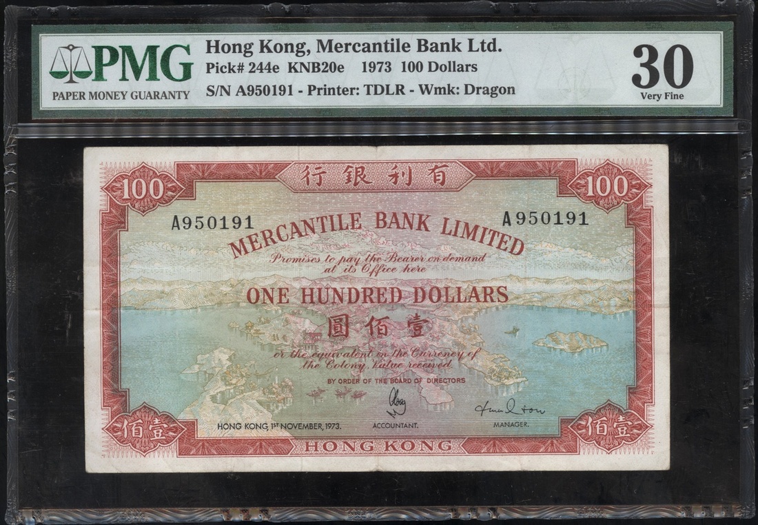 Mercantile Bank Limited, 100 Dollars, 1.11.1973, serial number A950191, red and multicoloured, map scene at centre, (Pick 244e), PMG 30 Very Fine