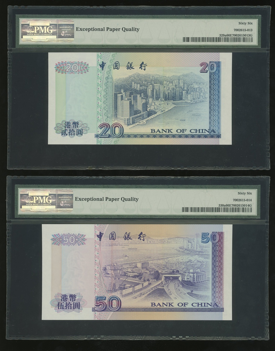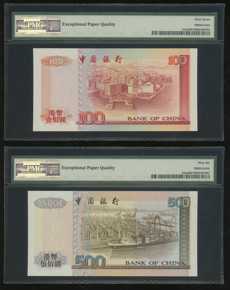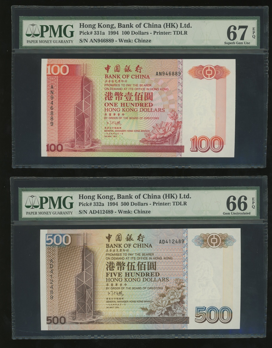 1994年中國銀行大全套一組5枚,$20至$1000,編號AM253689,AA609489,AN946889,AD412489及AC317889,分別評PMG 66EPQ, 66EPQ, 67EPQ, 66EPQ 及 66EPQ