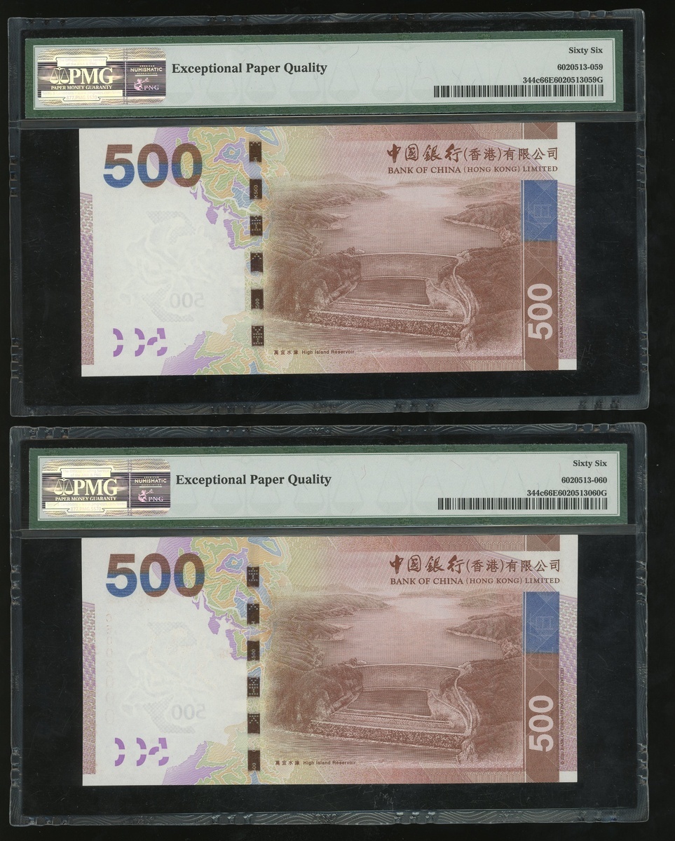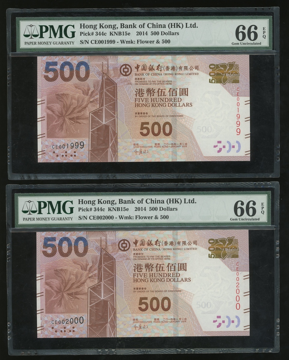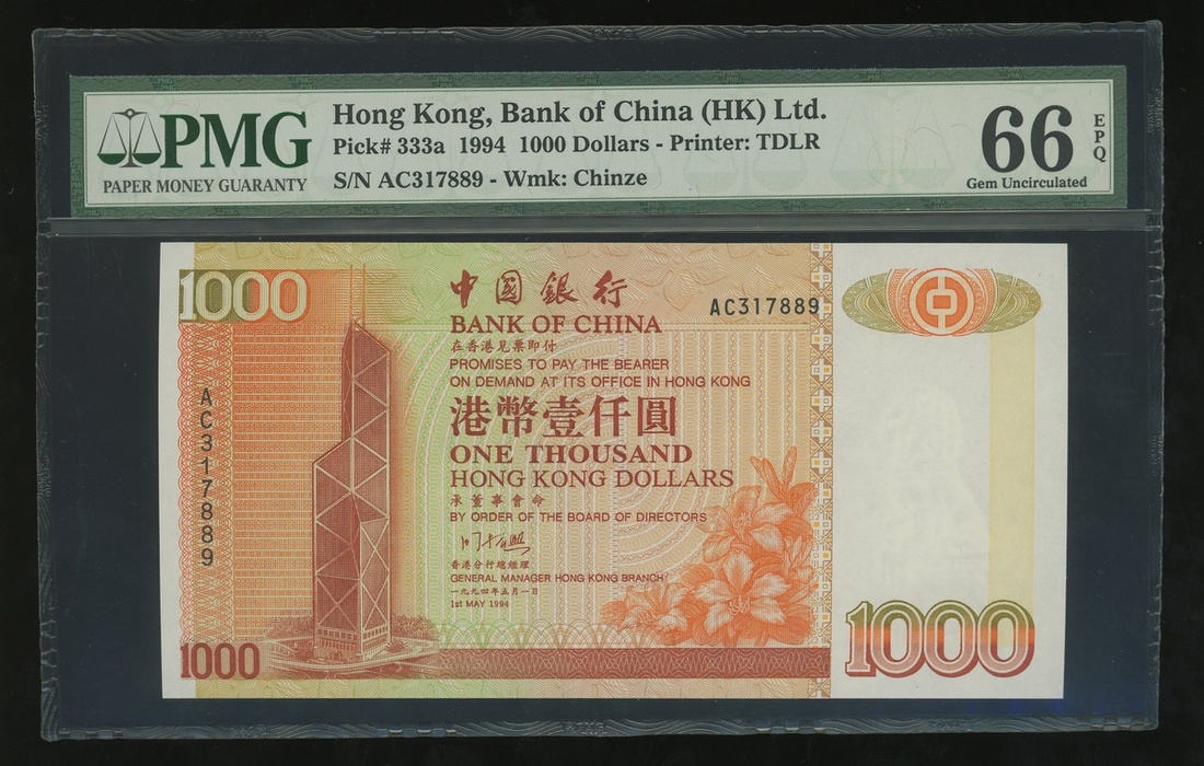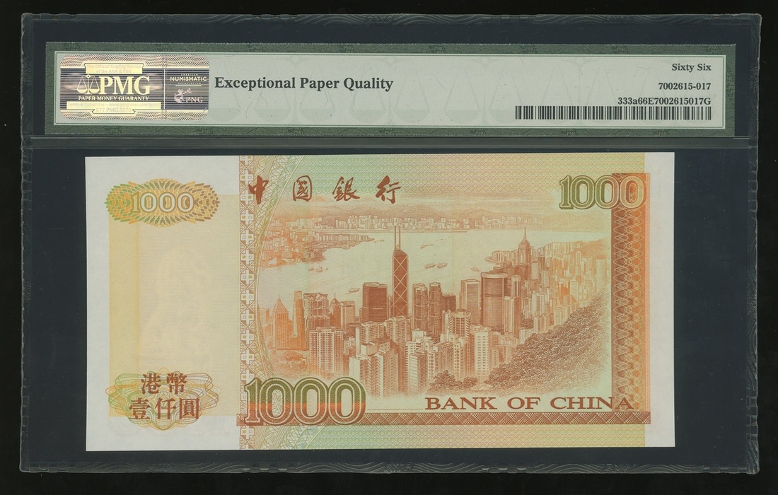 1994年中國銀行大全套一組5枚,$20至$1000,編號AM253689,AA609489,AN946889,AD412489及AC317889,分別評PMG 66EPQ, 66EPQ, 67EPQ, 66EPQ 及 66EPQ