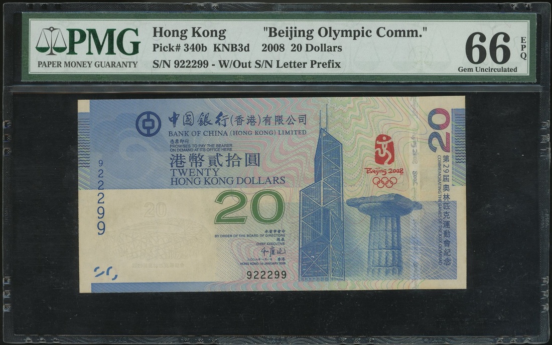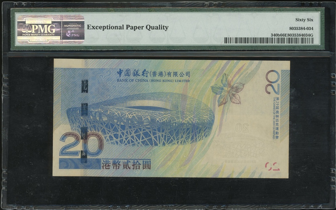 2008年中國銀行北京奧運紀念20元,編號922299,PMG 66EPQ,連原裝紙套