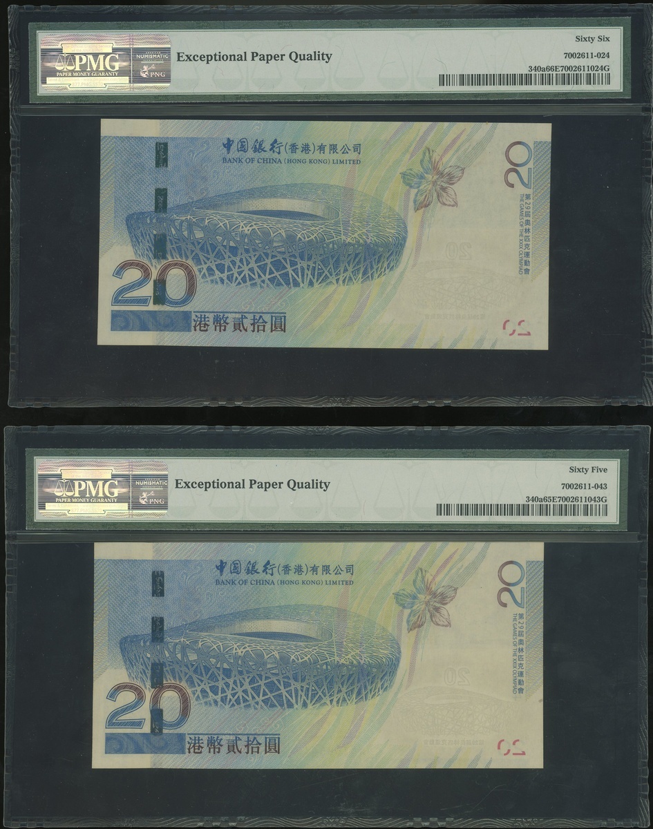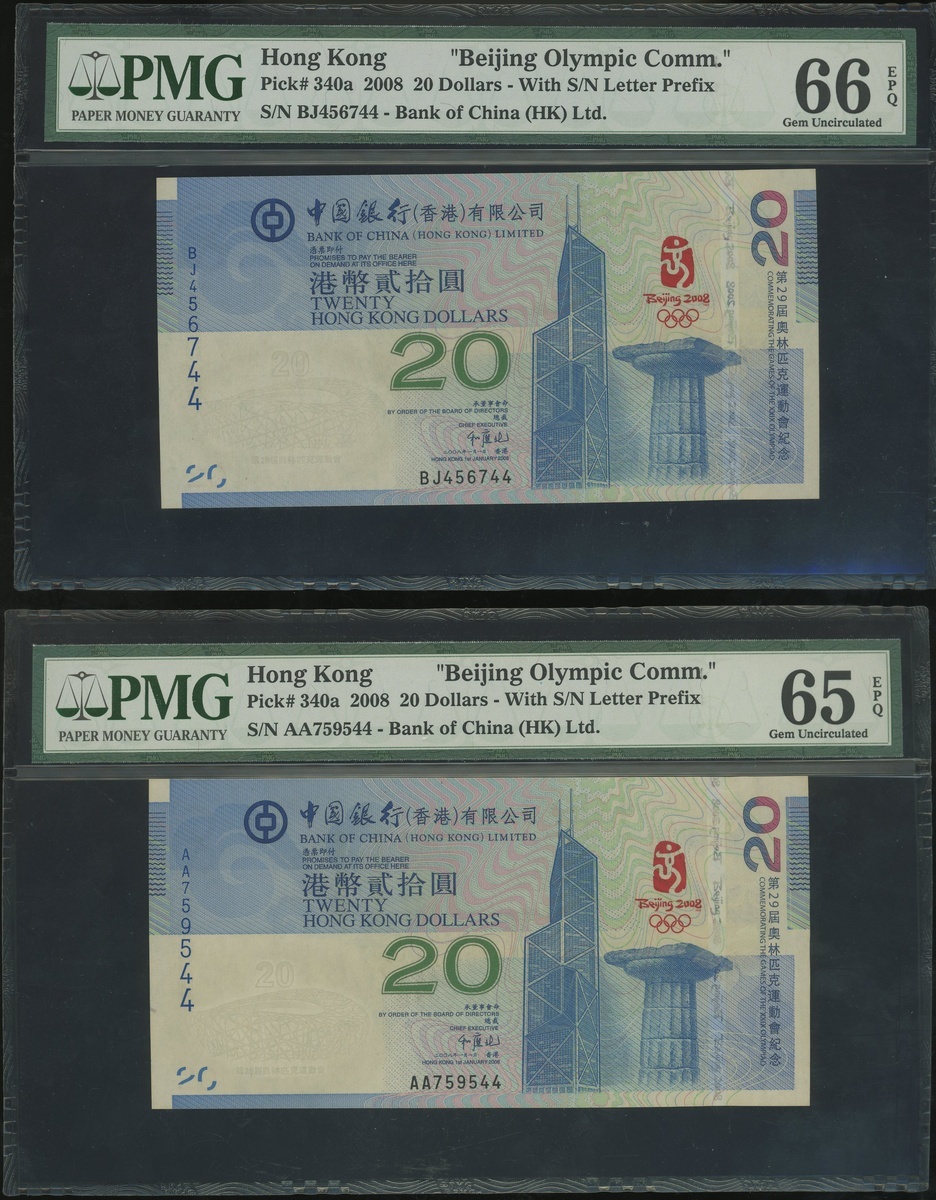2008年中國銀行北京奧運紀念20元兩枚,編號BJ456744及AA759544,分別評PMG 66EPQ及65EPQ,連原裝紙套