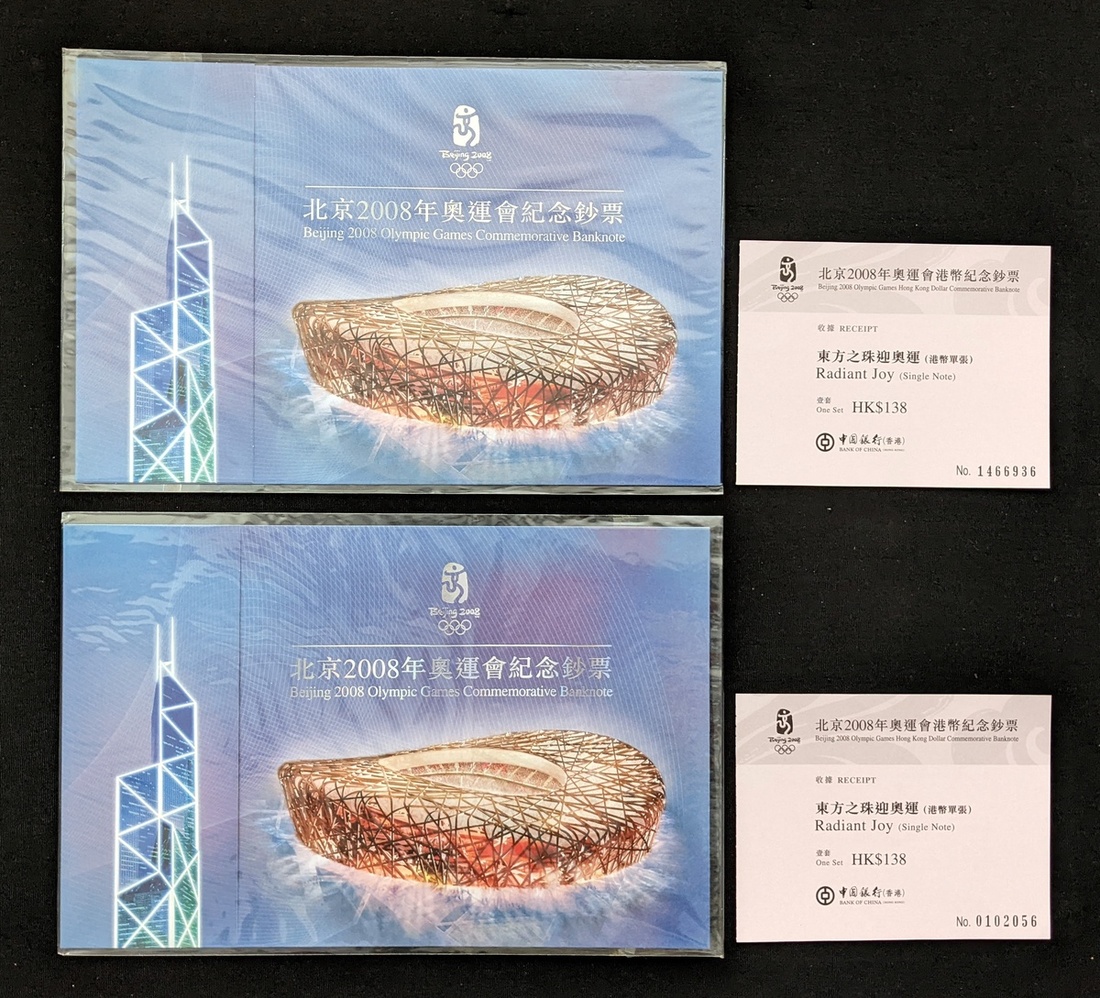 Bank of China, a pair of $20, 1.1.2008, serial numbers BJ456744, AA759544, Beijing 2008 Summer Olympics commemorative issue,