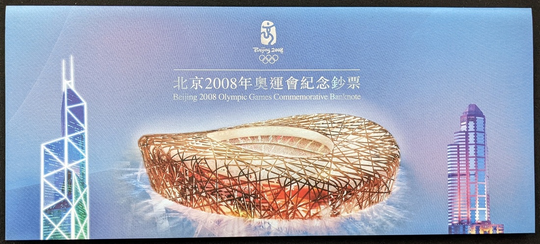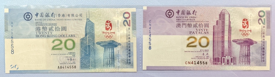 Bank of China, a set of Beijing 2008 Olympics commemorative banknotes, 20 Hong Kong dollars, serial number AA414558, and 20 Macau patacas, serial number CN414558,