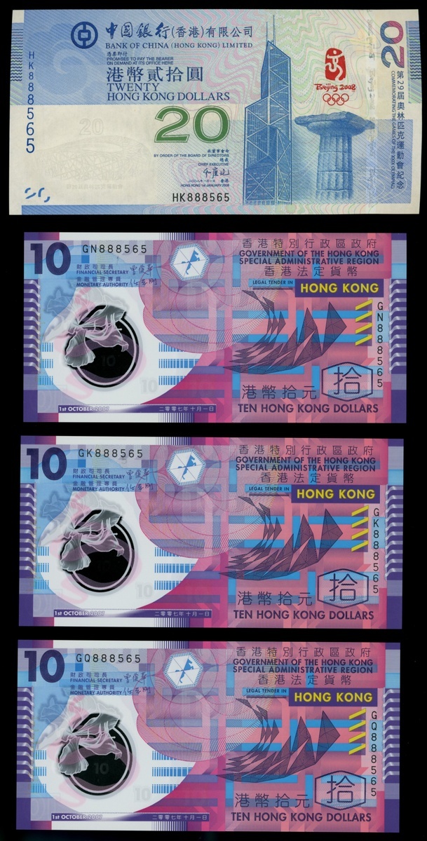 Hong Kong, group of 5 notes with matching serial numbers consisting of: Government of Hong Kong, $10, 1.10.2007, GK/GN/GQ 888565