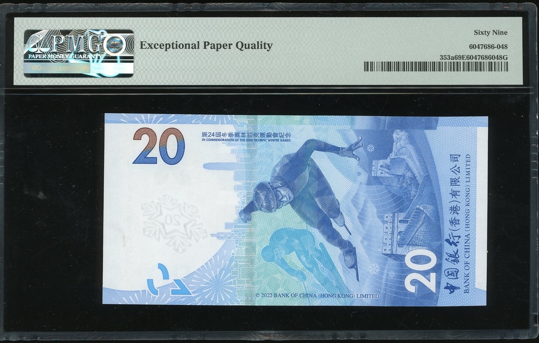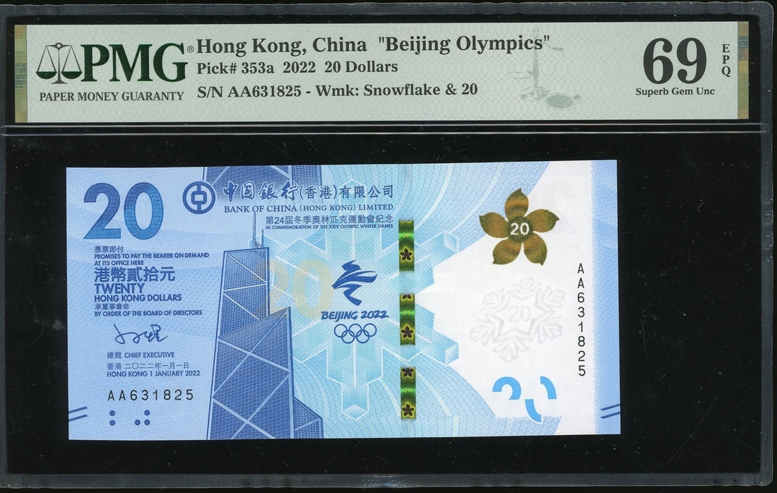 2022年中國銀行北京冬季奧運紀念20元,編號AA631825,PMG 69EPQ